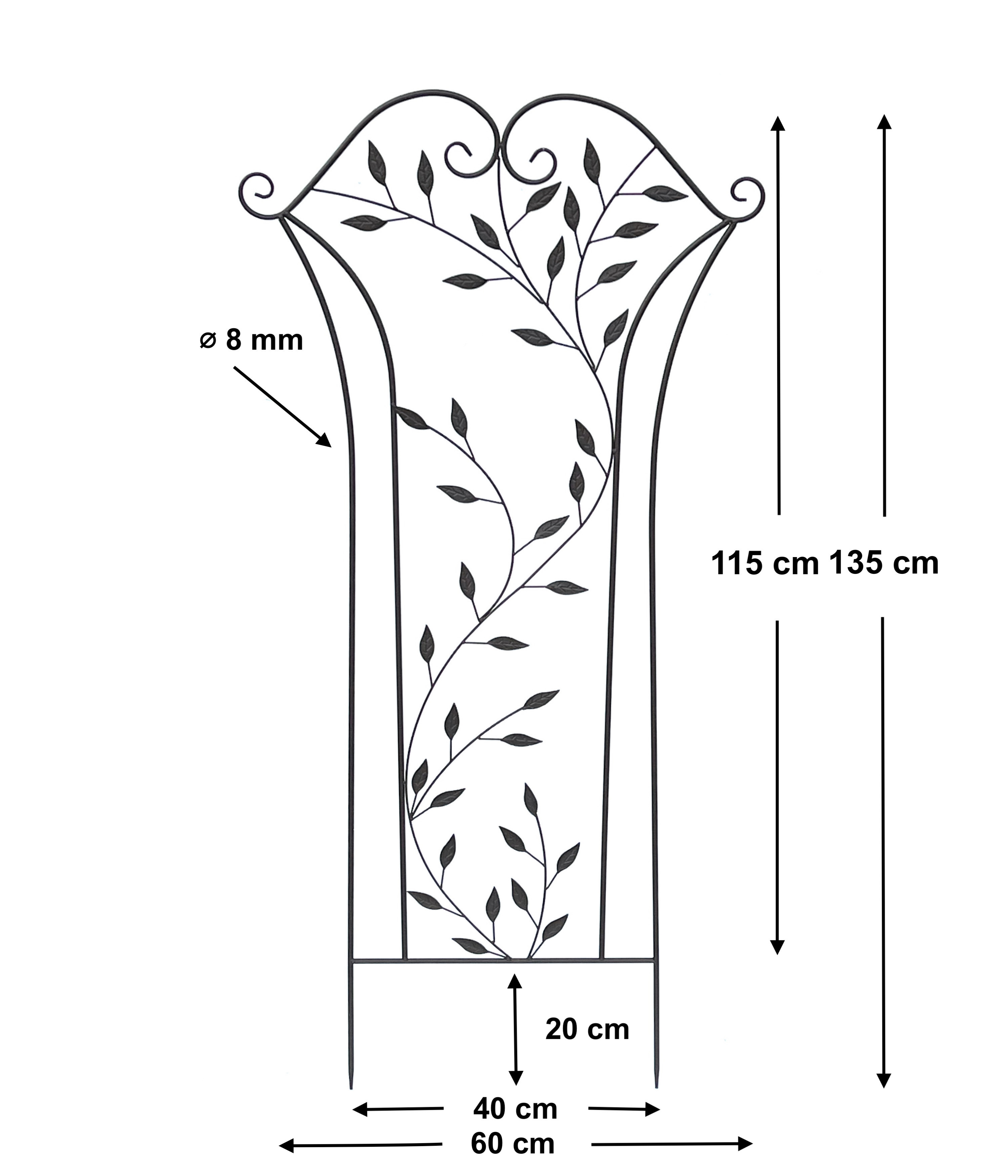 Maße: Gesamthöhe 135 cm, Breite 60 cm, Spießlänge 20 cm, Durchmesser vom Metall: 8 mm