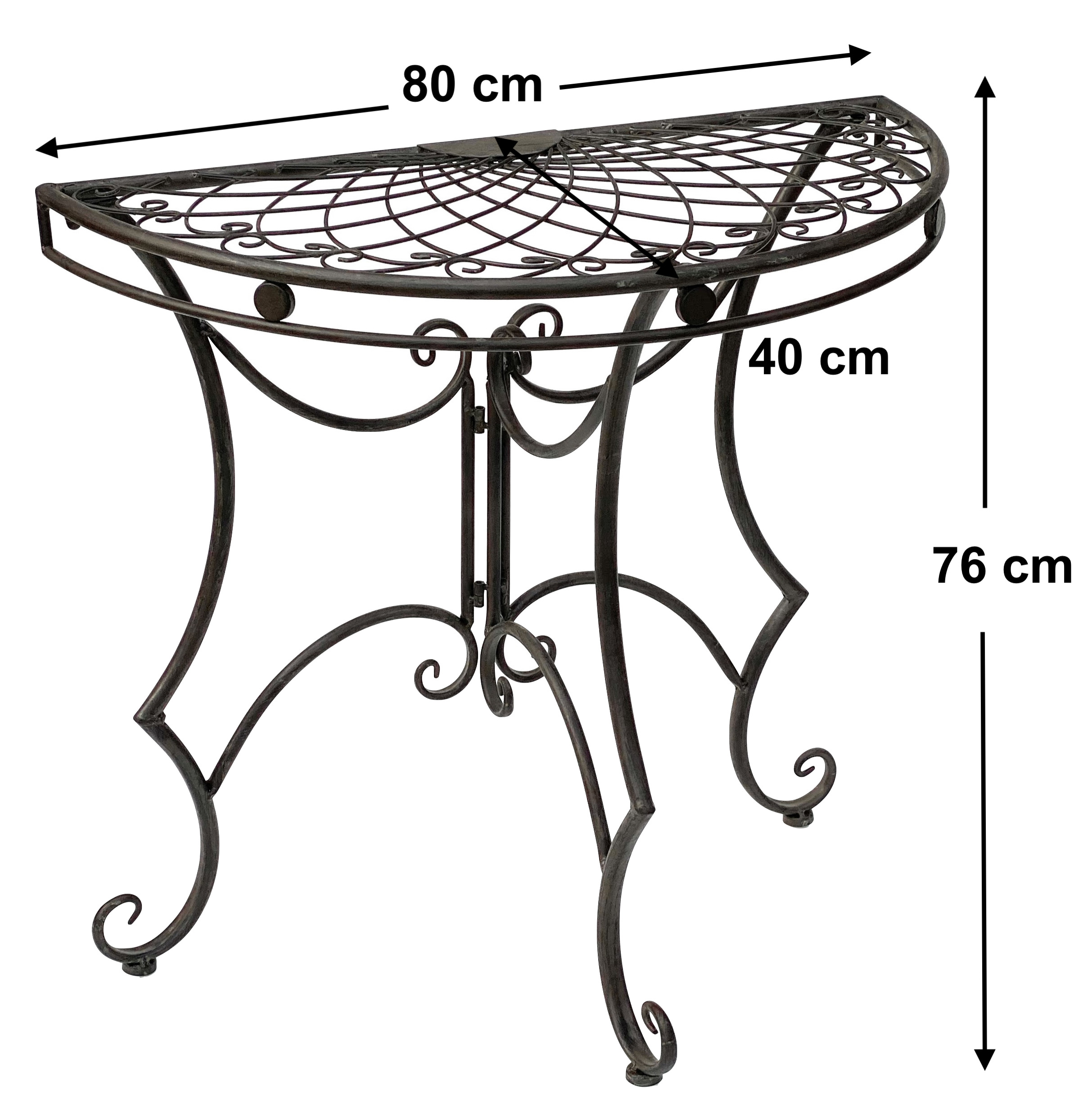 Unser stilvoller Abstelltisch, mit einer Breite von 80 cm in halbrund, ergänzt prachtvoll Ihre Wohnzimmer, Flur, Balkon, Garten oder Ihre Terrasse.
