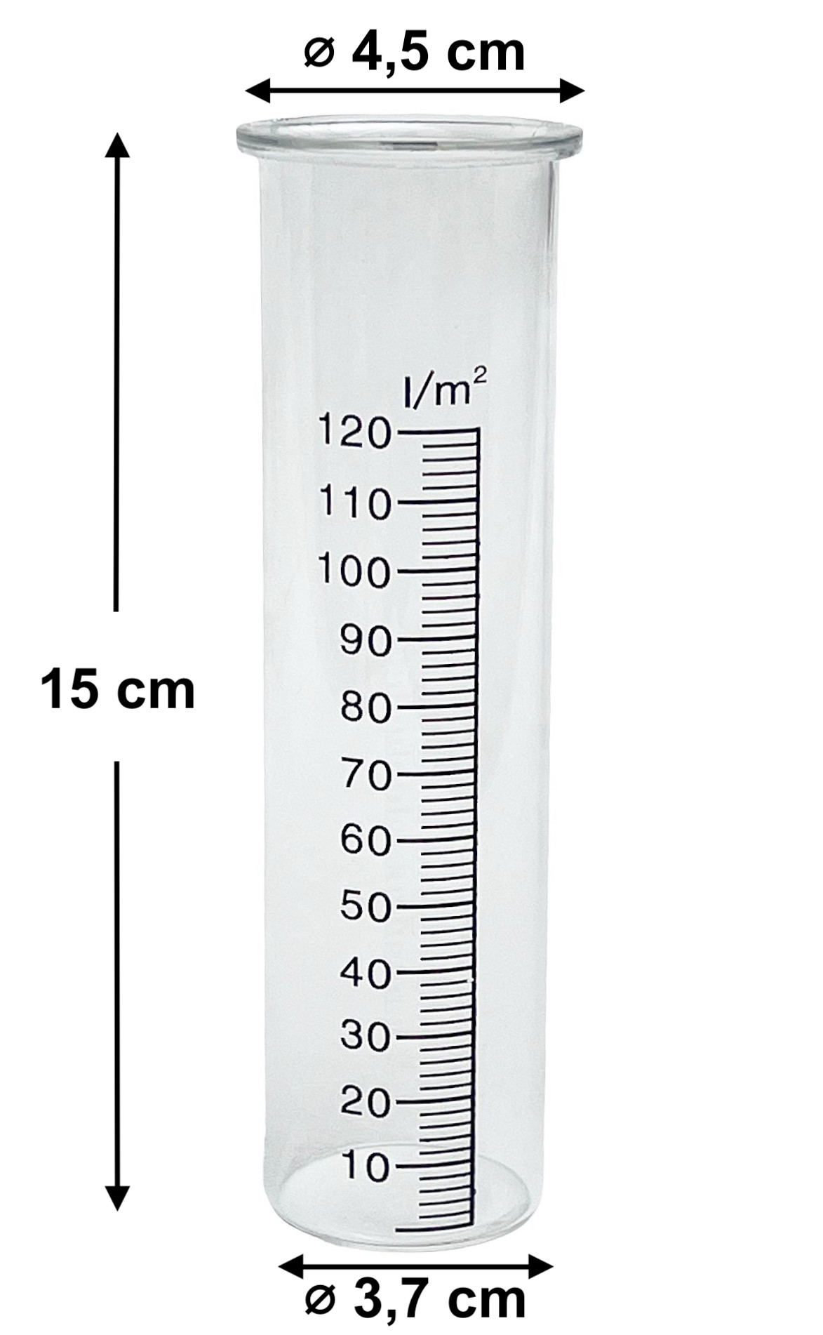 Ersatzglas für Regenmesser - Wetterfrosch, Eulen, Hase, Schnecke und Schildkröte Glasdurchmesser: 3,9 cm, Oberer Glasrand Durchmesser: 4,5 cm benötigt Ringdurchmesser 4,0 cm Länge 15 cm Echtglas mit Skala