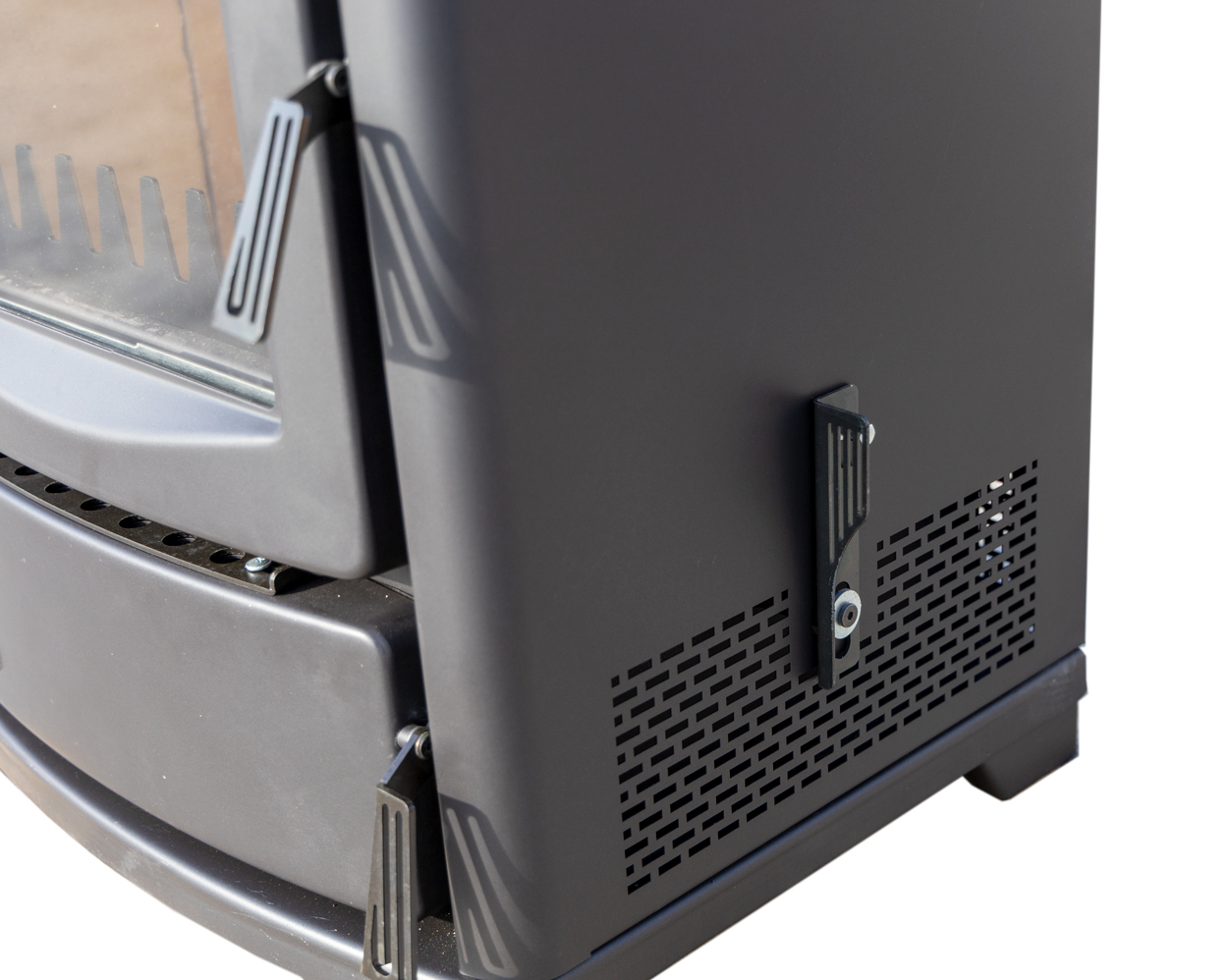 Sie können die Aschereinigung von außen vornehmen, indem Sie auf der Seite des Ofens den dafür vorgesehenen Griff betätigen / drehen.