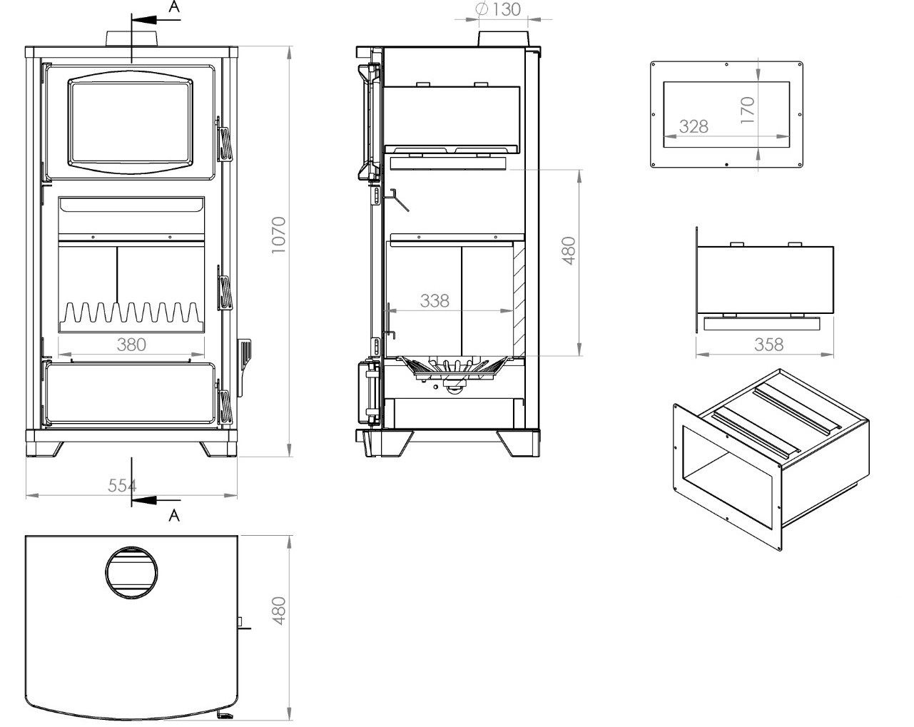 - Brennkammer: Tiefe 33 cm, Breite 38 cm, Höhe 48 cm