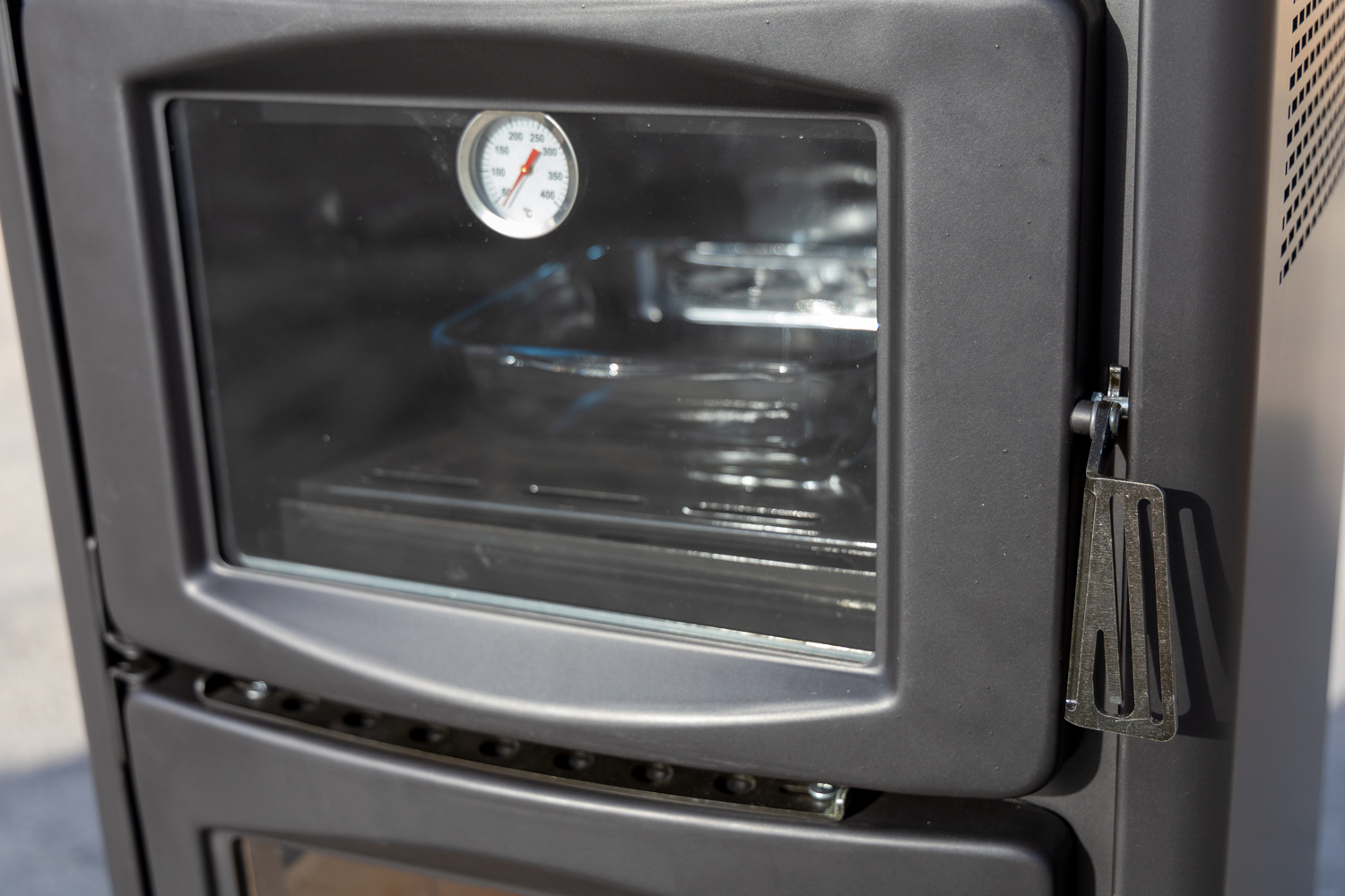Zur Kontrolle der Temperatur im Backofen ist ein Thermometer an der Scheibe angebracht.