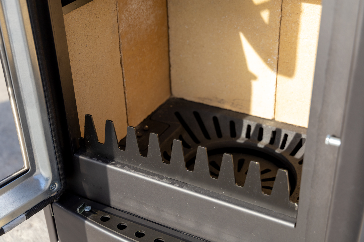 Vollständig massive Brennraumauskleidung mit Schamotte. Herausnehmbares Aschefach.