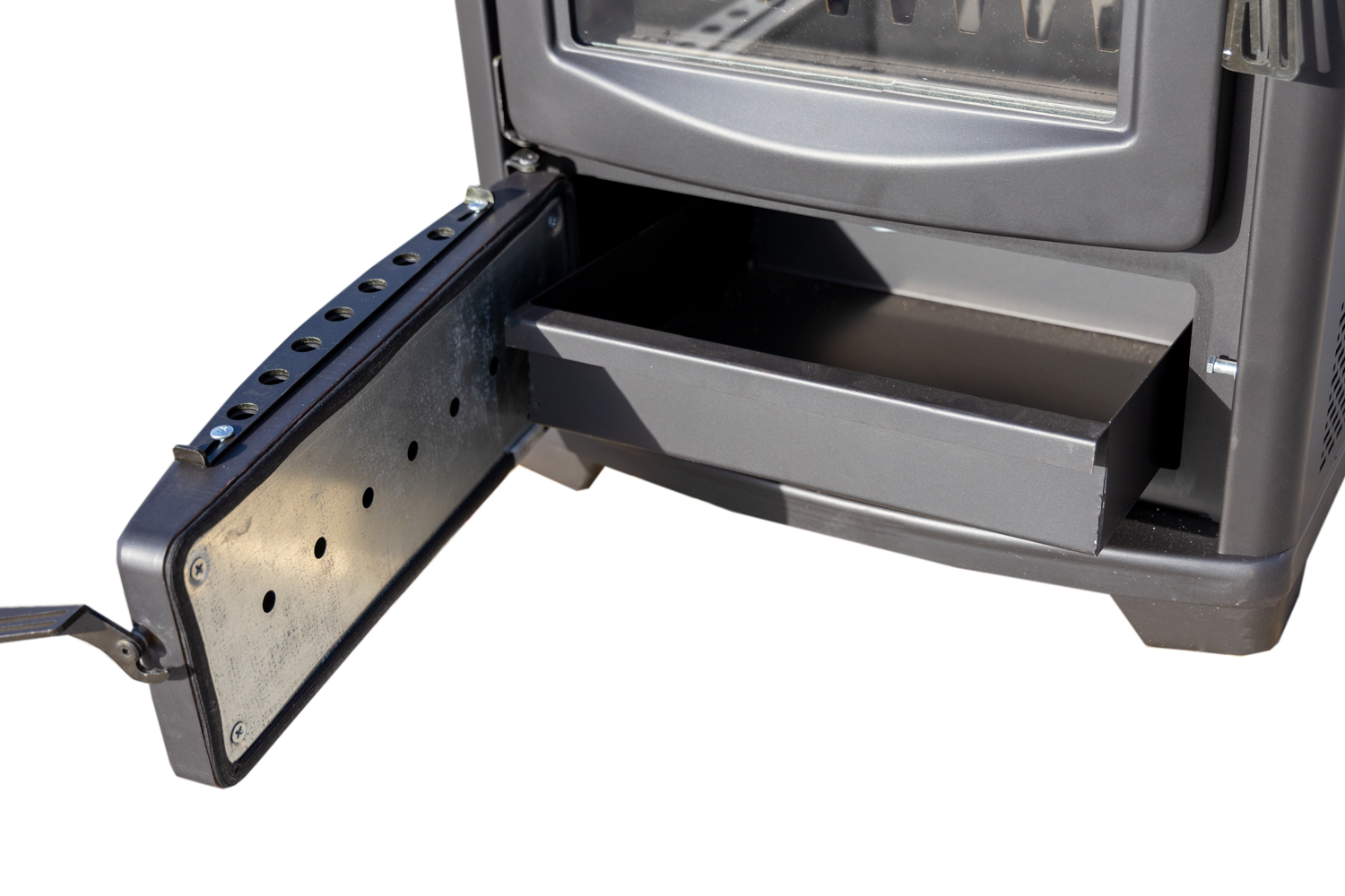 Somit fällt die Asche vom Rost direkt in das Aschefach und kann direkt entnommen werden. Sie müssen somit nicht extra mit Schürhaken oder ähnlichem die Asche aus der Brennkammer entfernen, so dass sich keine Asche durch das Reinigen vor dem Ofen verteilen kann.