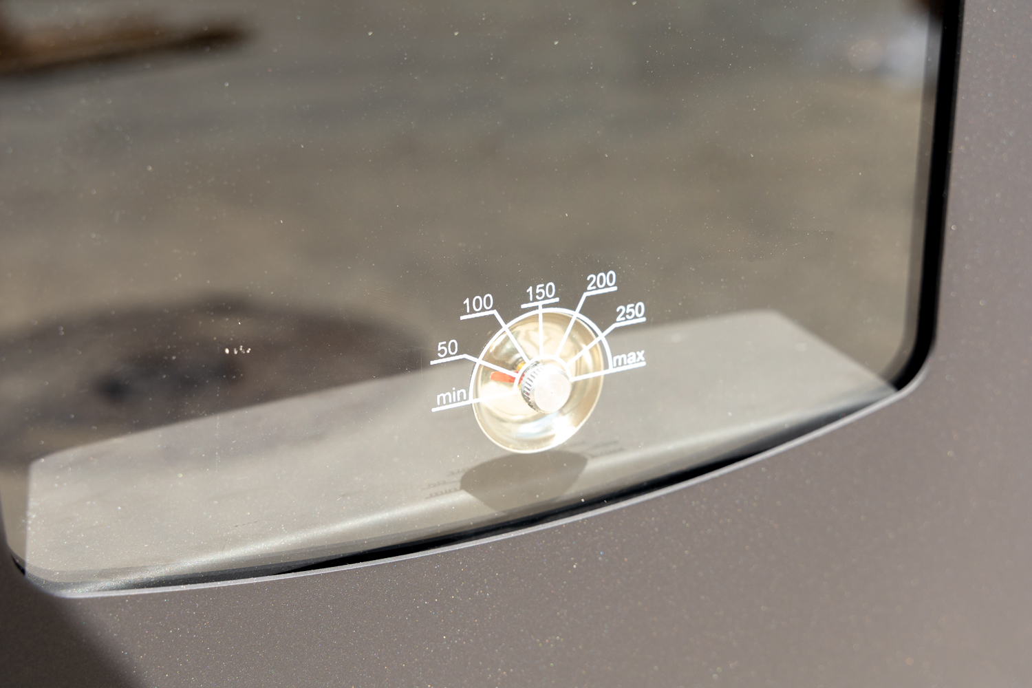 Zur Kontrolle der Temperatur im Backofen ist ein Thermometer an der Scheibe angebracht.