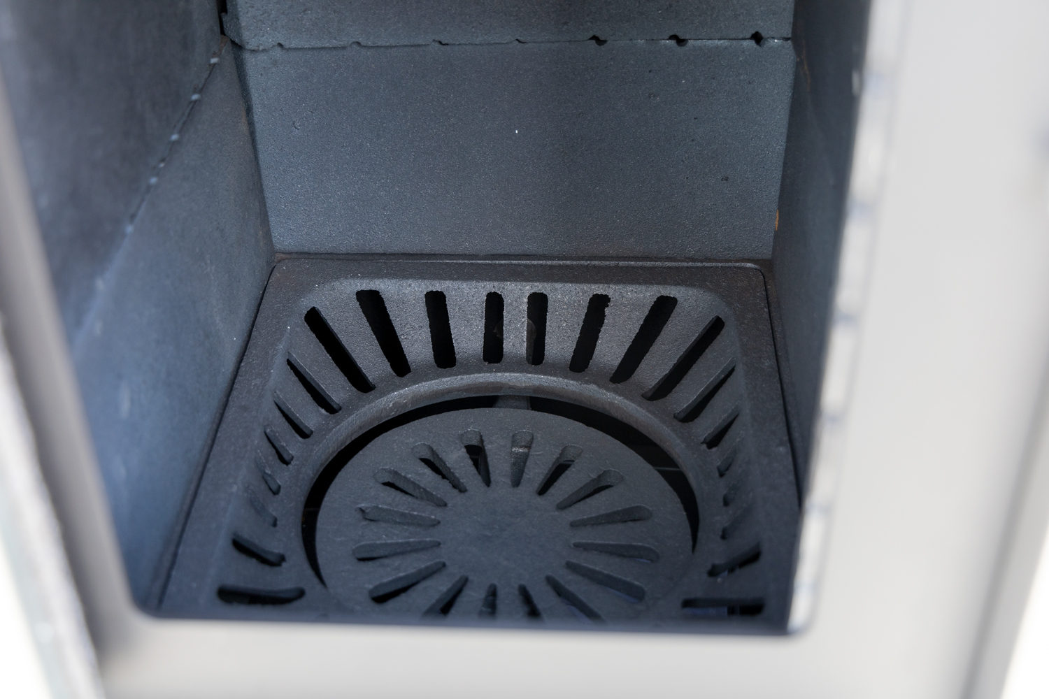 Damit die Wärme des Feuers besser gespeichert wird, ist die Brennkammer mit Gusseisenplatten verkleidet.