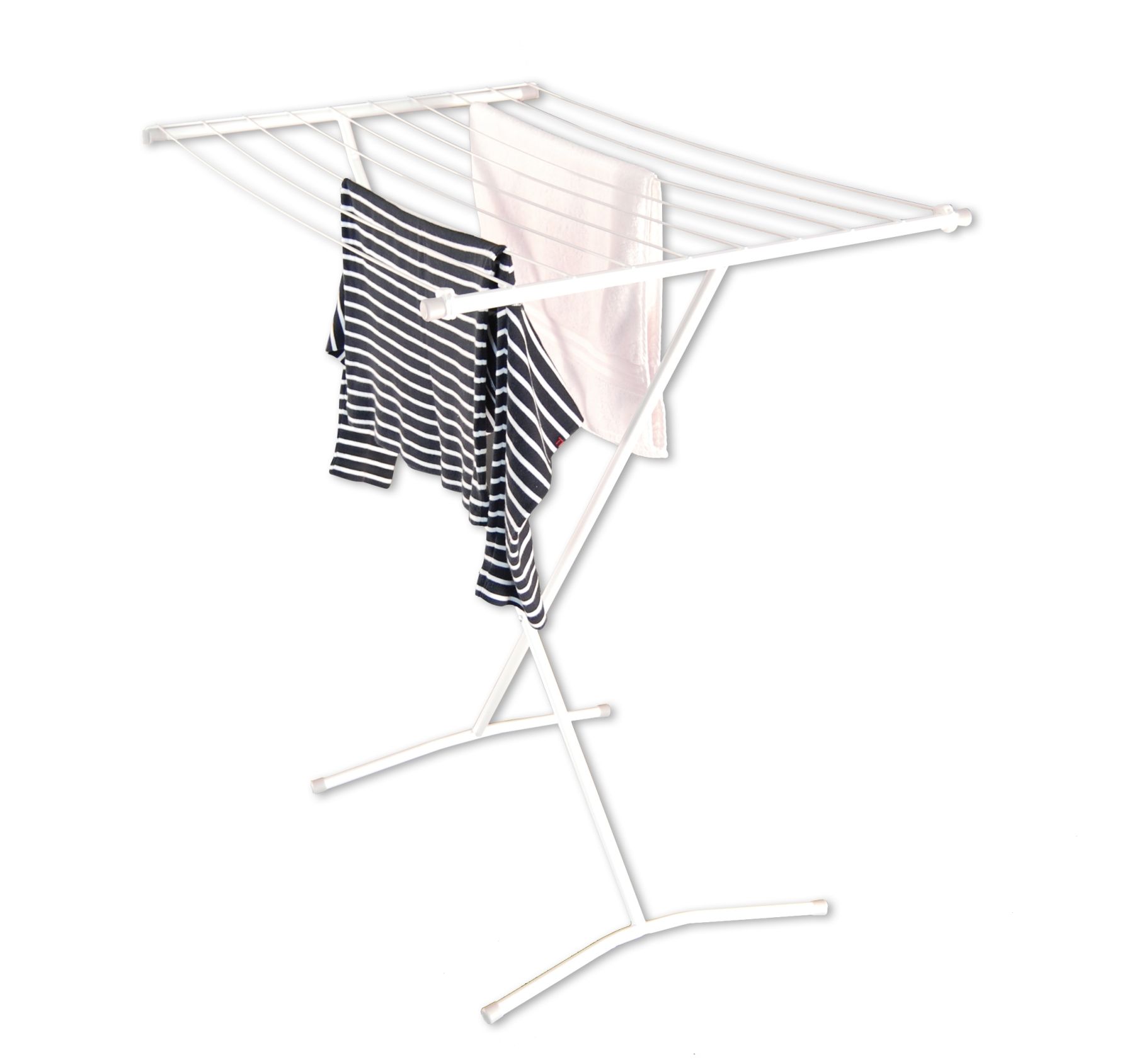 Aufklappbarer und zusammenfaltbarer Wäscheständer. Die Lieferung erfolgt fertig montiert.