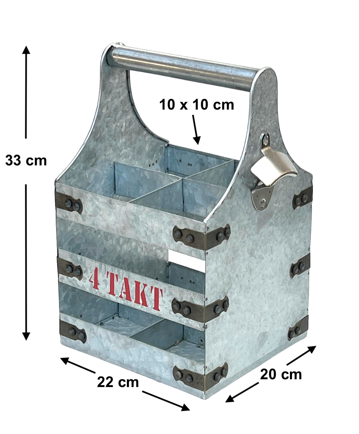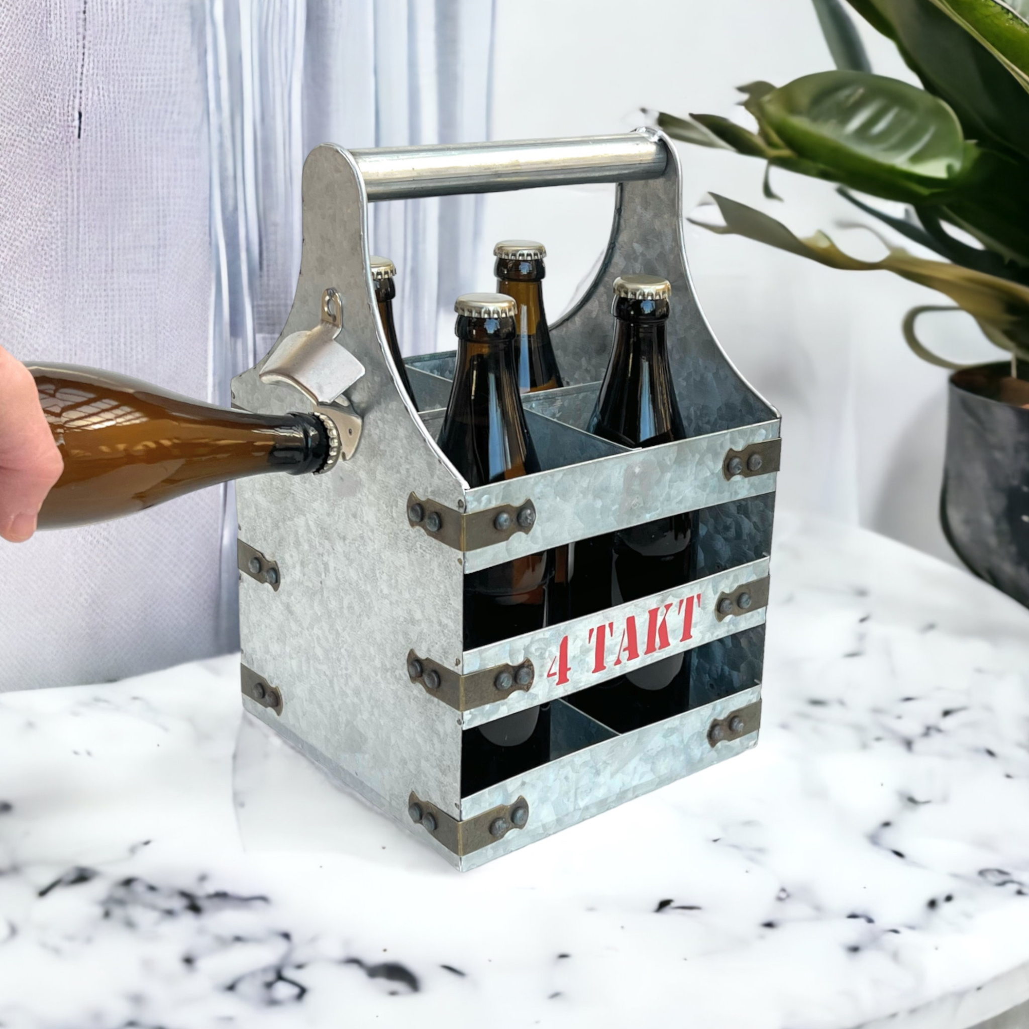 Der DanDiBo Bierträger aus Metall mit Flaschenöffner und beidseitiger Aufschrift 4 Takt ist perfekt für jede Gartenparty, Picknick, BBQ oder Ausflug.