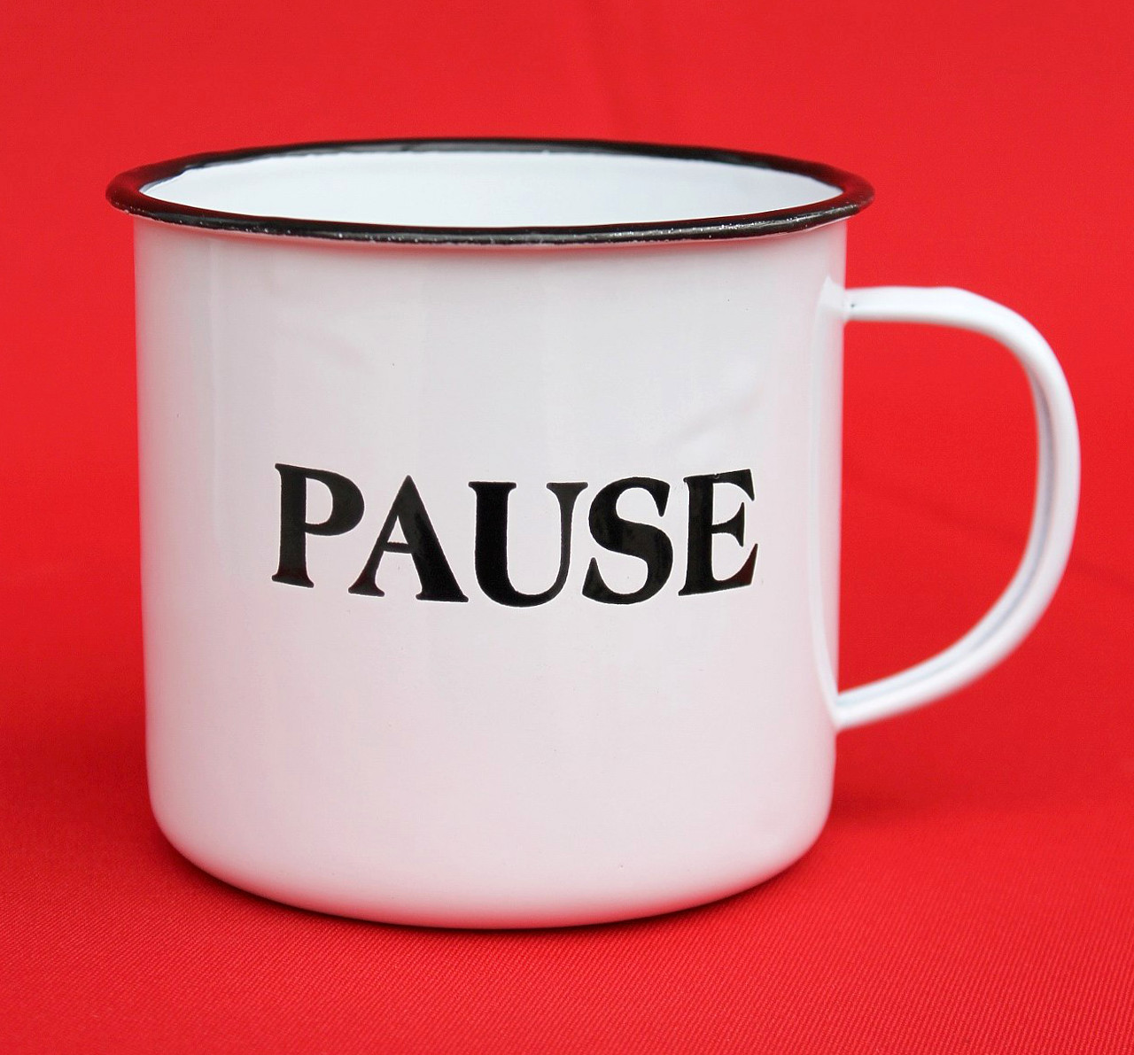 Emaille Tasse „Pause“ mit Griff. Sehr dekorativ.