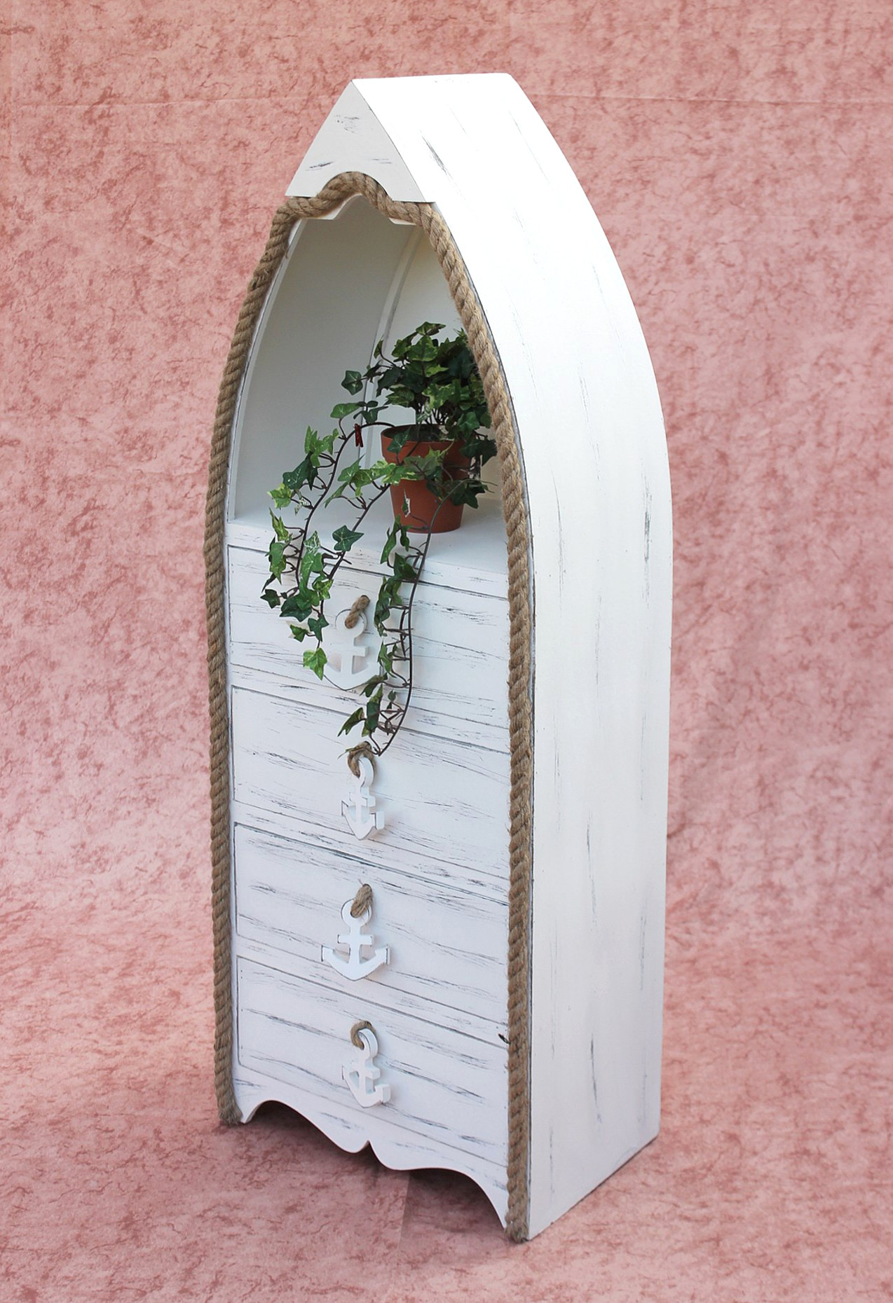 Boot-Schrank Badezimmermöbel. Kommode mit 4 Schubladen. Aus MDF gefertigt und Weiß lackiert. Sehr dekorativ. Maße: Höhe ca. 117cm, Breite 41cm, Tiefe ca. 27cm. Schubladenabmessungen Innen: Breite 33 cm, Tiefe 22 cm, Höhe 12 cm Zustand: Neuware. Sofort lieferbar.
