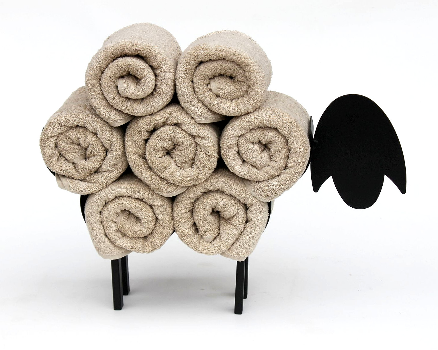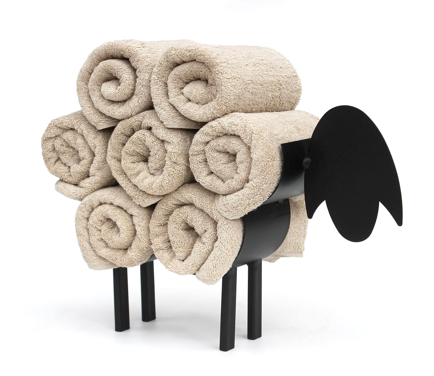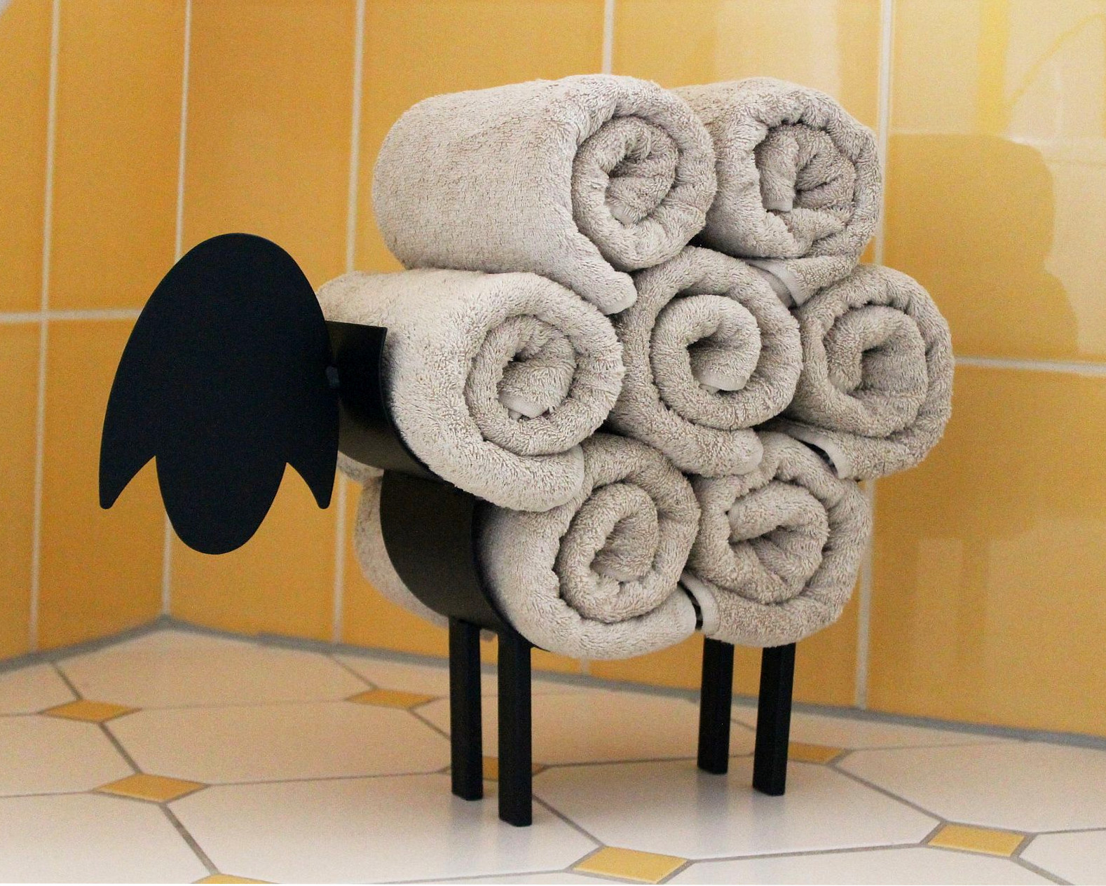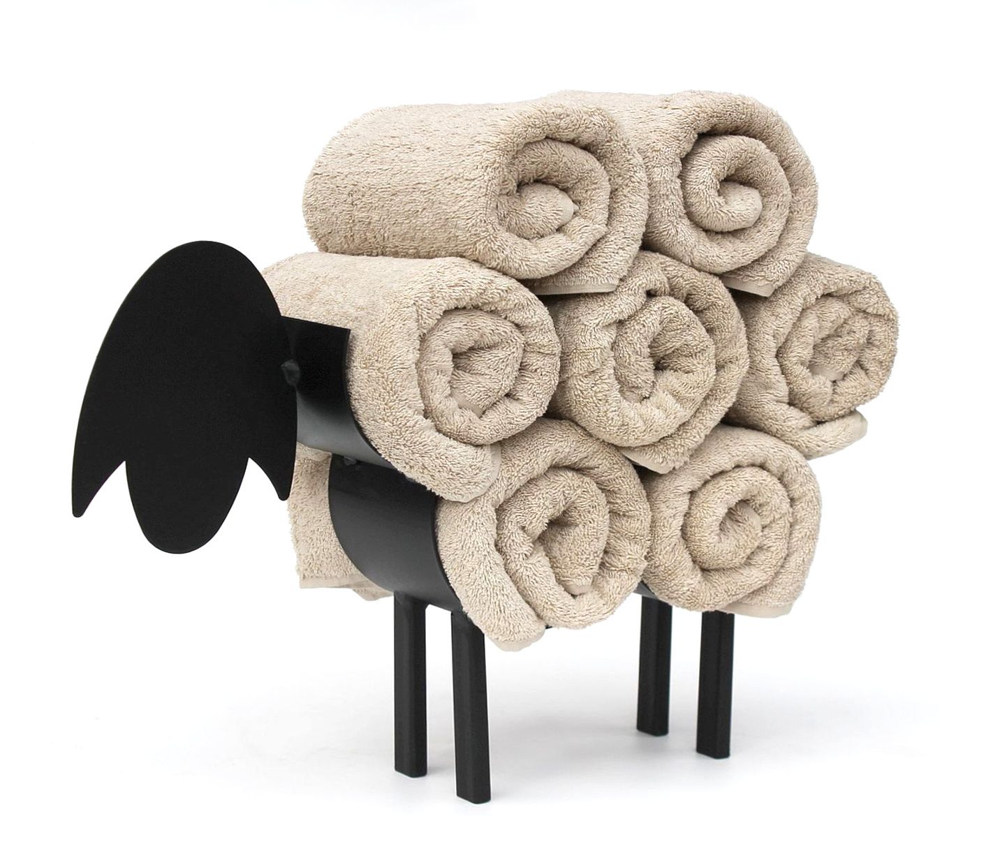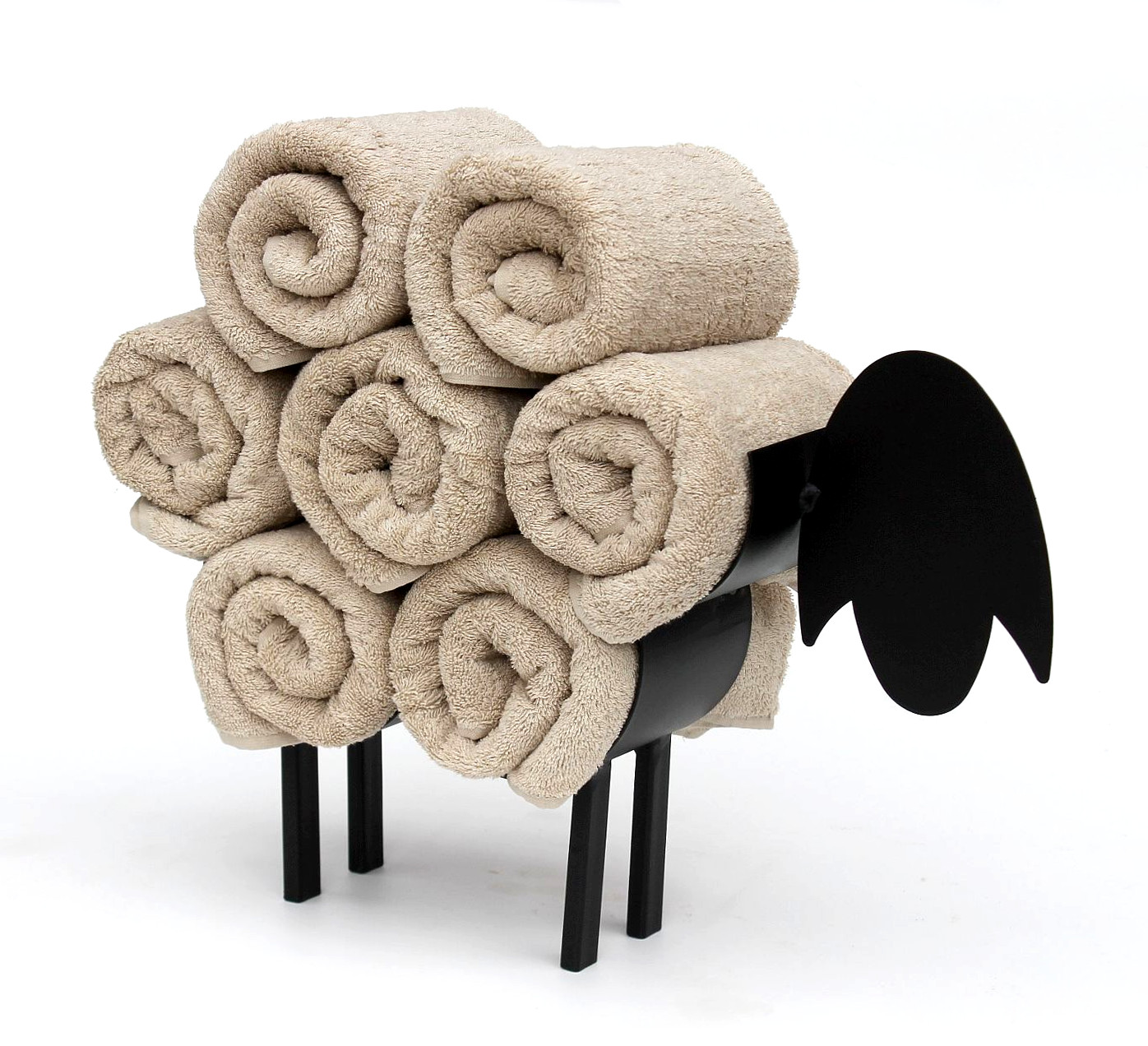 Das Schaf kann bis zu 7 Handtücher (Abmessungen: 100x50cm) auf seinem Rücken halten, der sichere freie Stand wird durch seine vier Füße gewährleistet.
