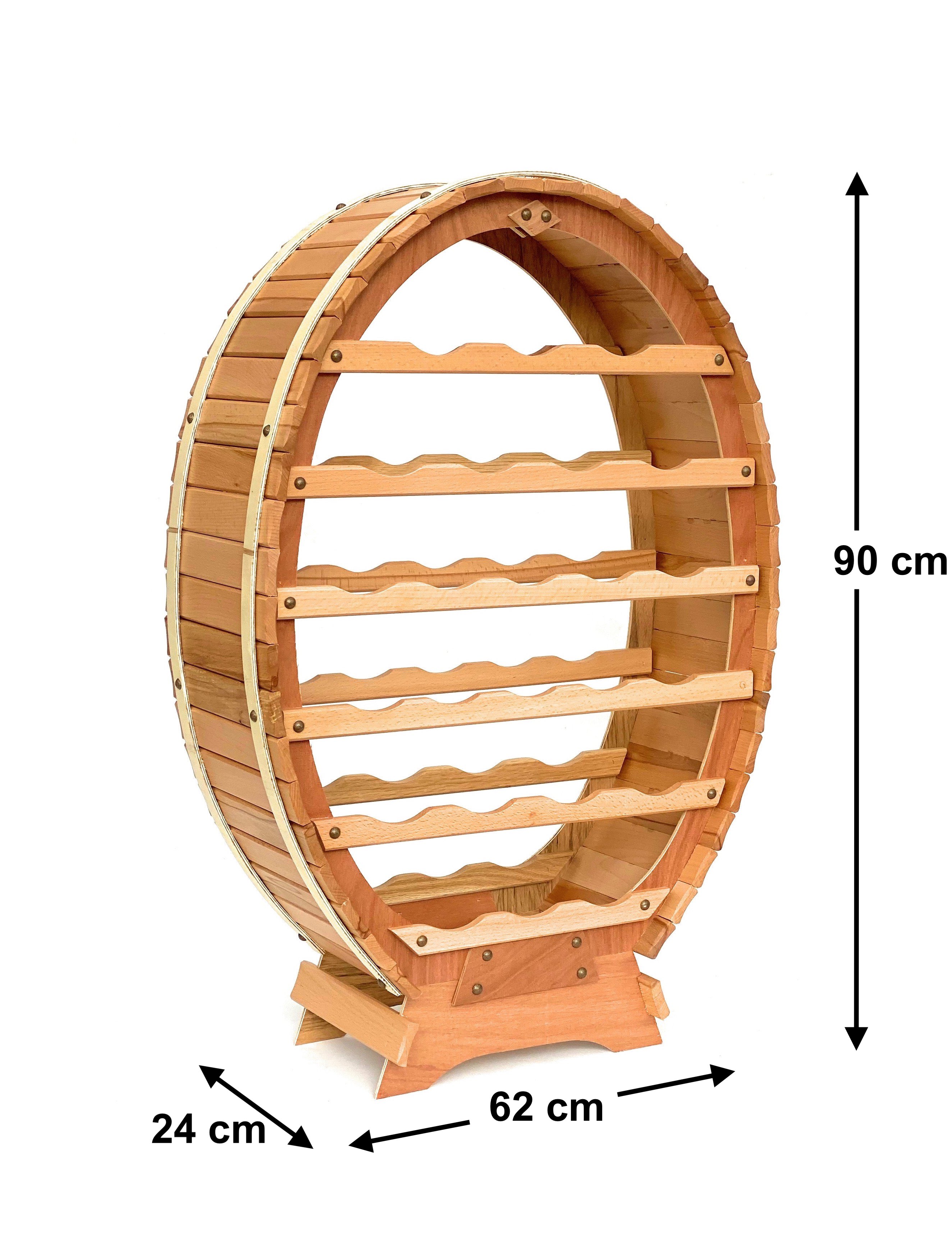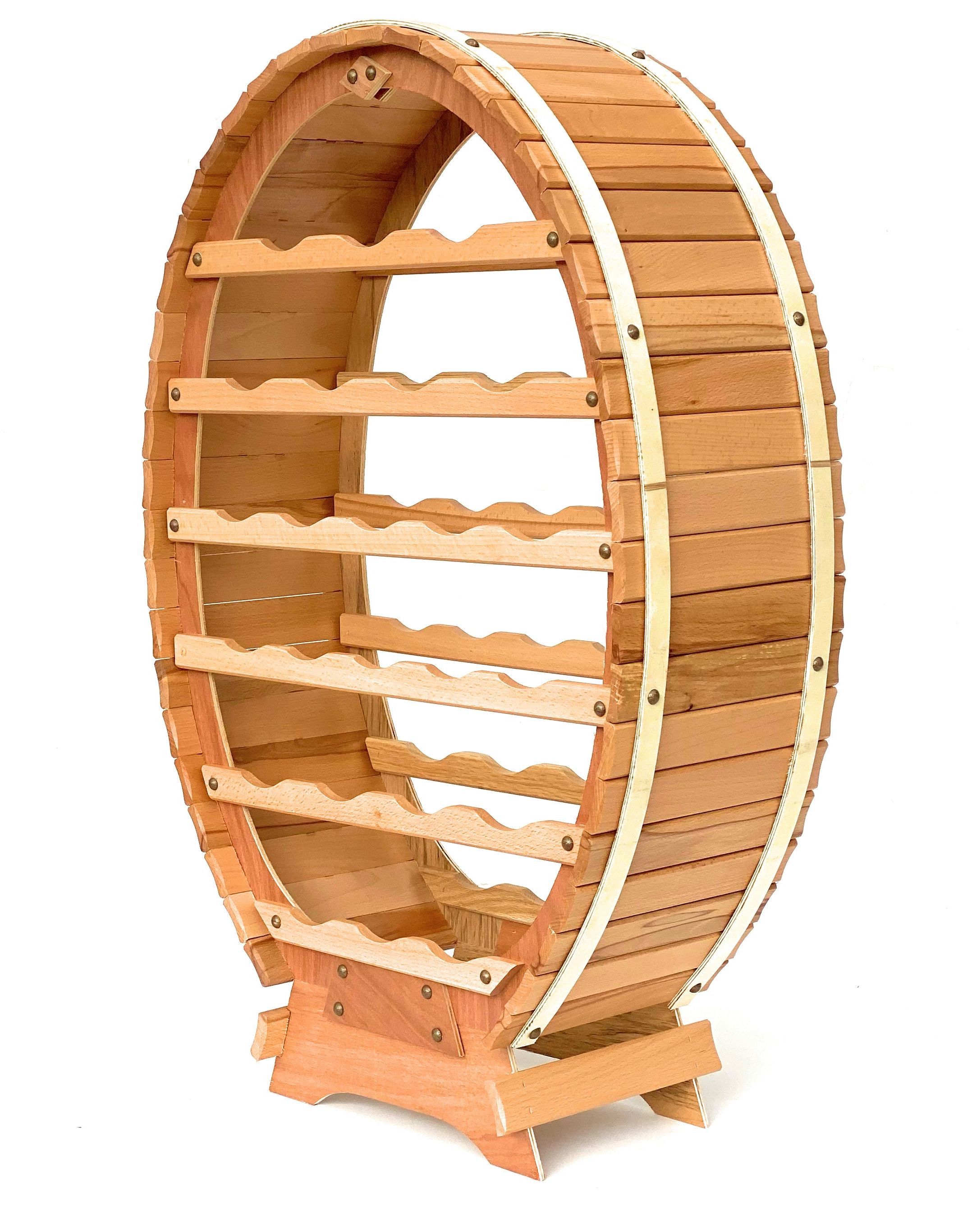 Hochwertiges Design Weinregal aus Holz gefertigt in der Form von einem Weinfass. Das Regal bietet Platz für bis zu 24 Flaschen, sowohl für 0,75 Liter als auch für 1,0 Liter Flaschen geeignet.
