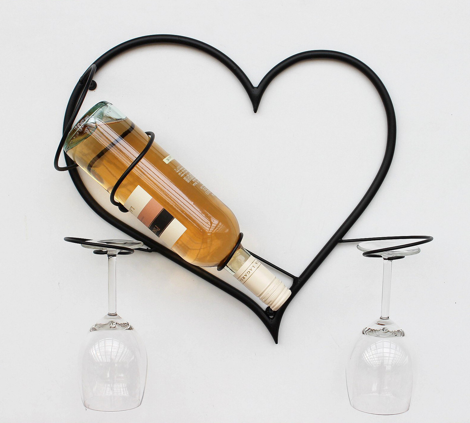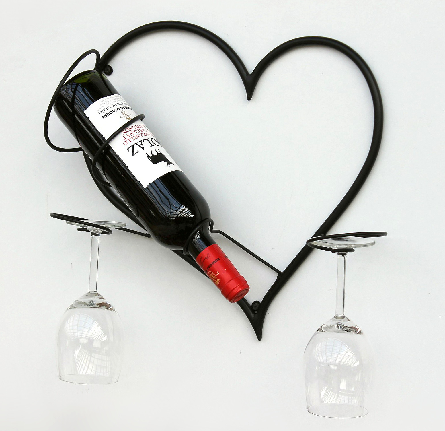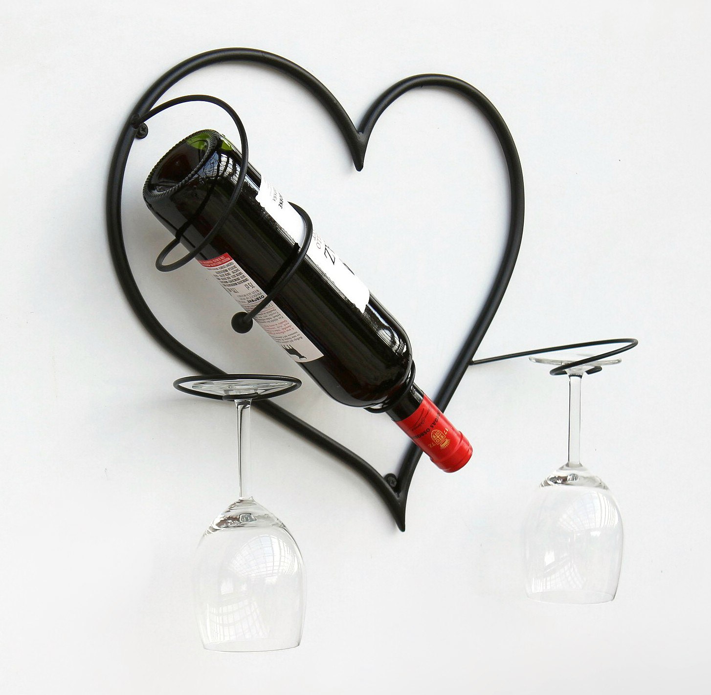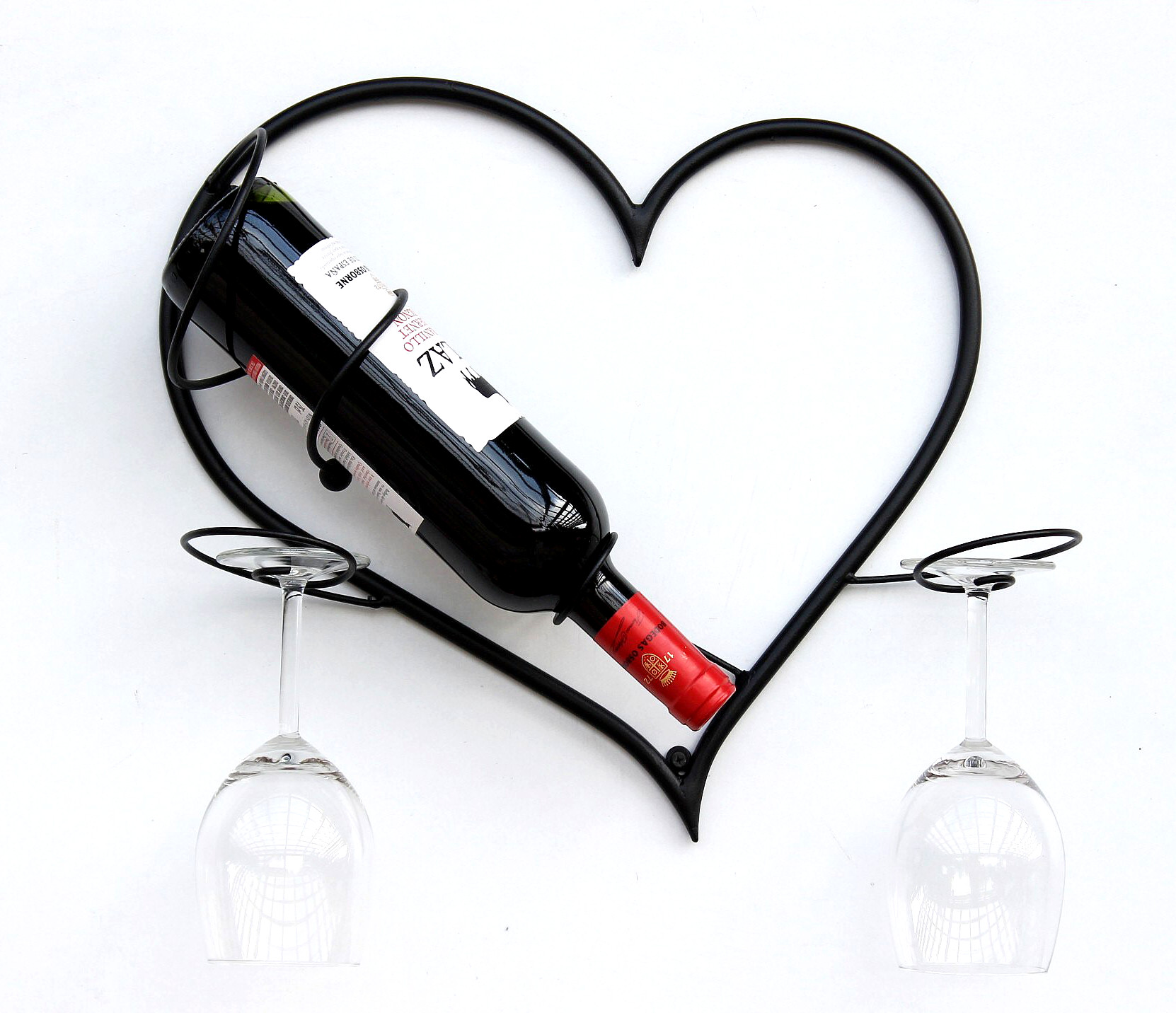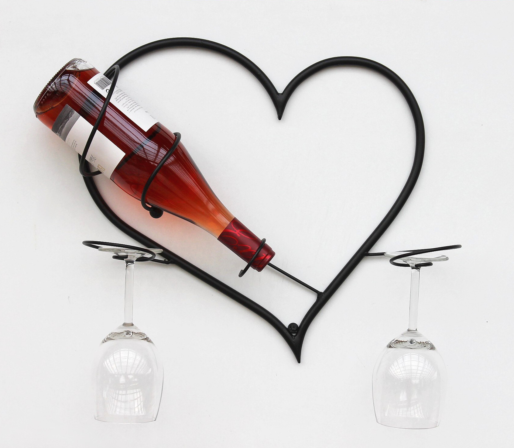 Wandbild Herz - Flaschenhalter. Aus Metall geschmiedet - Sehr dekorativ. Pulverbeschichtet. Farbe - Schwarz. Geeignet auch für 1 Literflaschen und Sektflaschen. Mit Platz für 2 Weingläser. Maße: Höhe 38 cm, Breite 38 cm, Tiefe 12 cm.