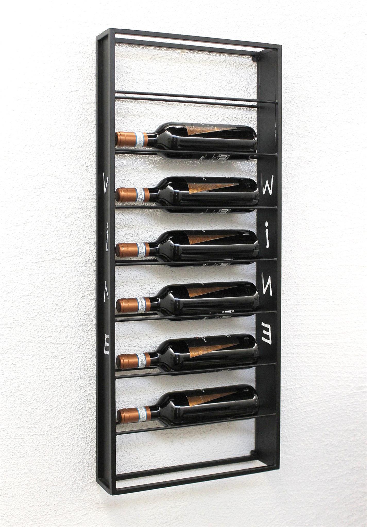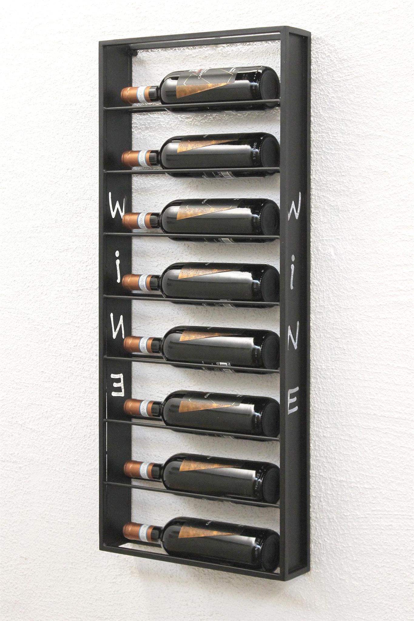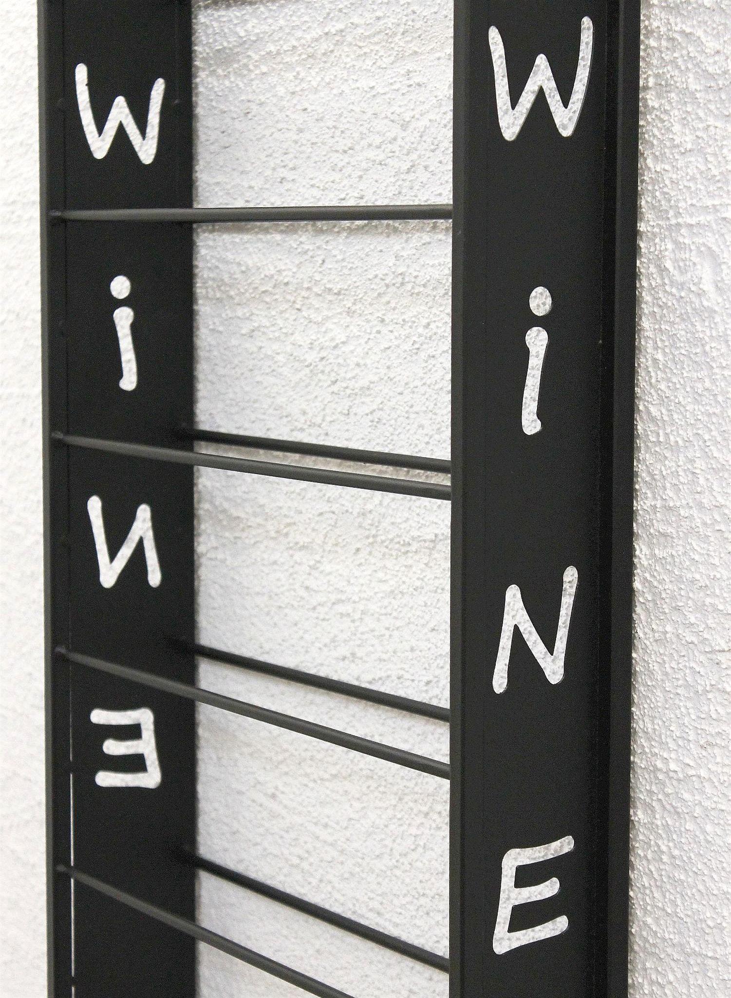 Hochwertiges Design Weinregal für die Wandmontage „Sofie“ mit Platz für 8 Flaschen. Aus Metall geschmiedet und pulverbeschichtet in der Farbe Schwarz.Mit ausgestanztem Schriftzug „Wine“ an den Seiten.