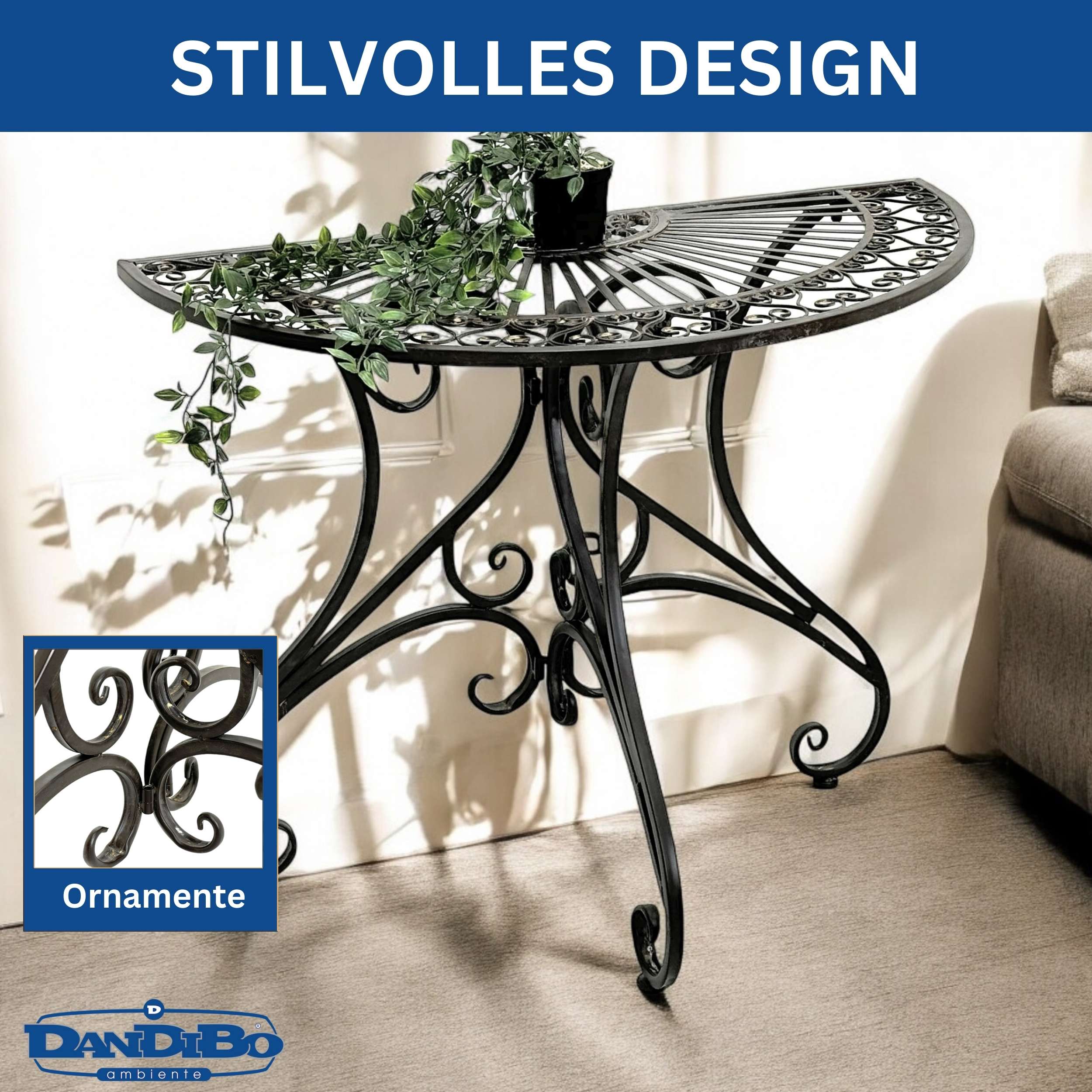 Elegantes und vielseitiges Design: Der halbrunde Beistelltisch Vigo 90 cm kombiniert kunstvolle Verzierungen mit einer schlanken, modernen Ästhetik, die sowohl klassische als auch zeitgenössische Außenbereiche aufwertet. Ideal für den Einsatz auf Balkon, Terrasse oder im Garten.