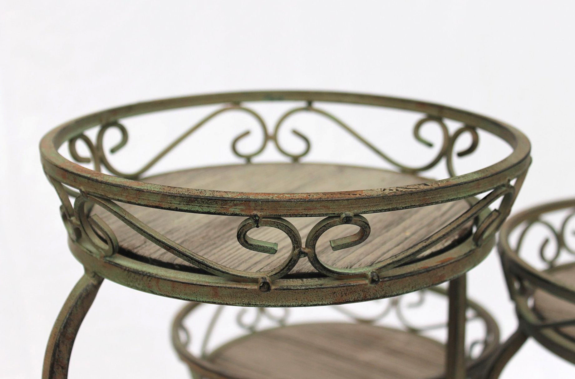 Sturdy and decorative flower staircase with three wooden shelves for your plants, flower pots or vases. Forged from metal and elaborately decorated. Patina antique colour. Dimensions: Height 72 cm (52, 62, 72 cm). Basket diameter 25 cm.