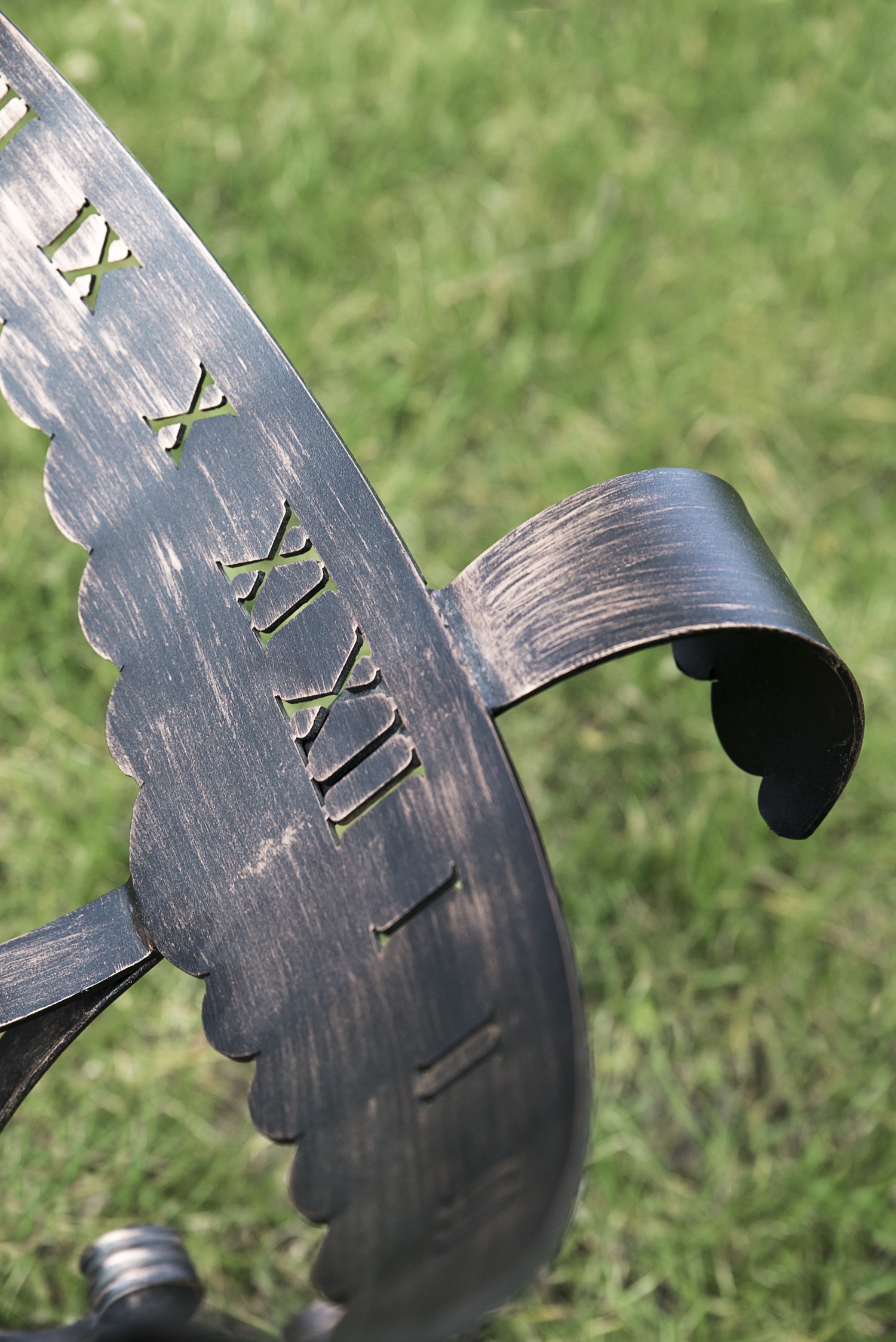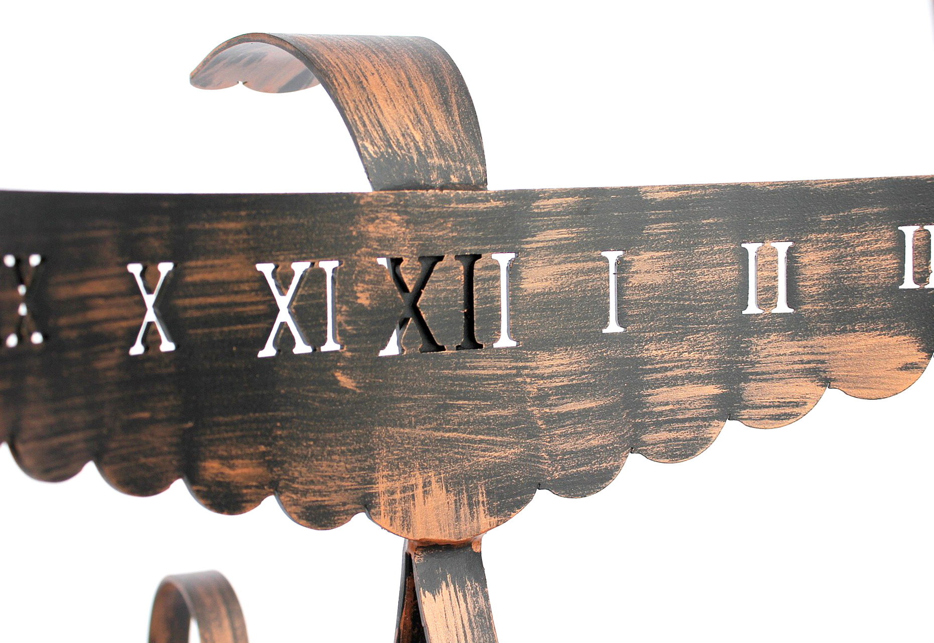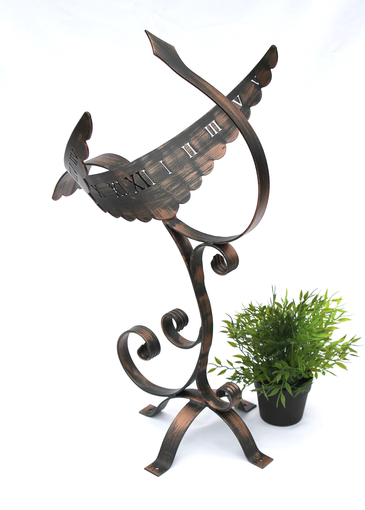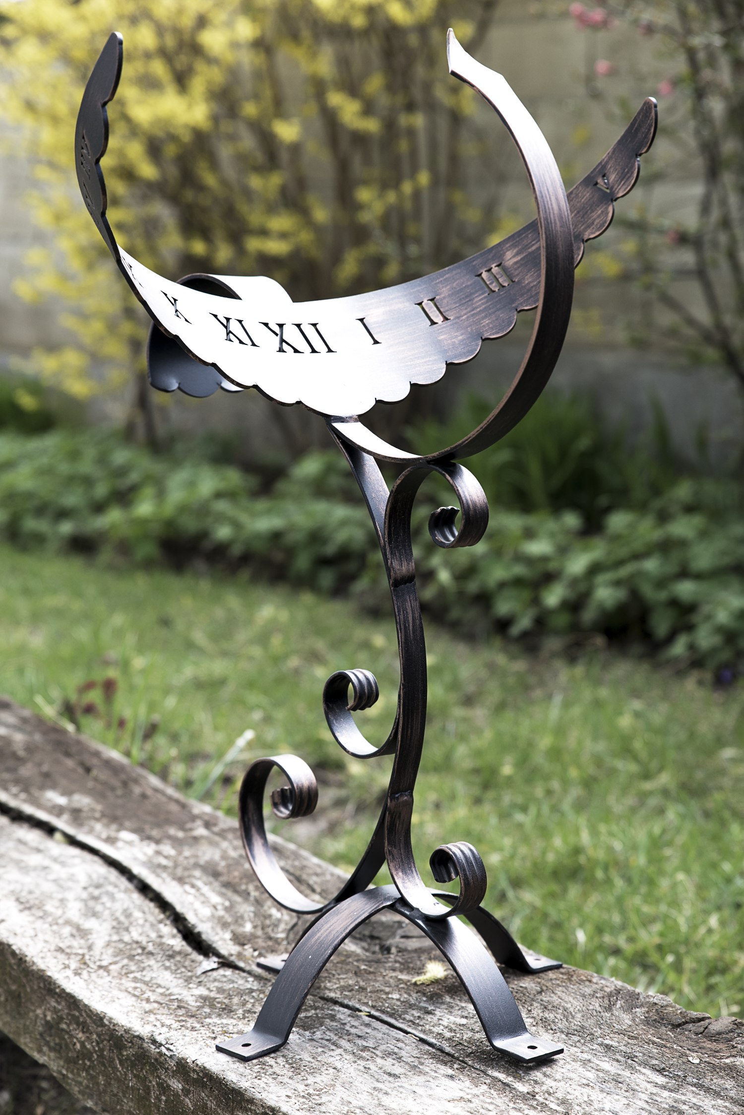 Beautiful sculpture sundial - weatherproof. Forged from metal and elaborately decorated. Powder-coated. Colour black and bronze. Dimensions: height 65 cm, width 40 cm, depth 38 cm. Base 26 x 26 cm.