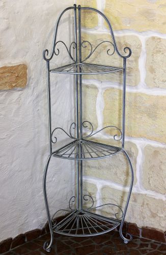 Metal corner shelf in romantic country house style - bathroom shelf.Forged from metal and elaborately decorated. Antique grey colour.Dimensions: Height: approx. 125 cm, width and depth approx. 33 cm. Shelves - width: 25 cm x 25 cm.