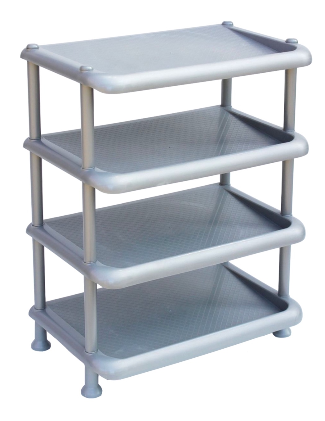 Shoe rack with 4 shelves, made of high-quality plastic in grey Quick and easy to assemble thanks to the plug-in system. Height 65 cm, width 49 cm, depth 30 cm