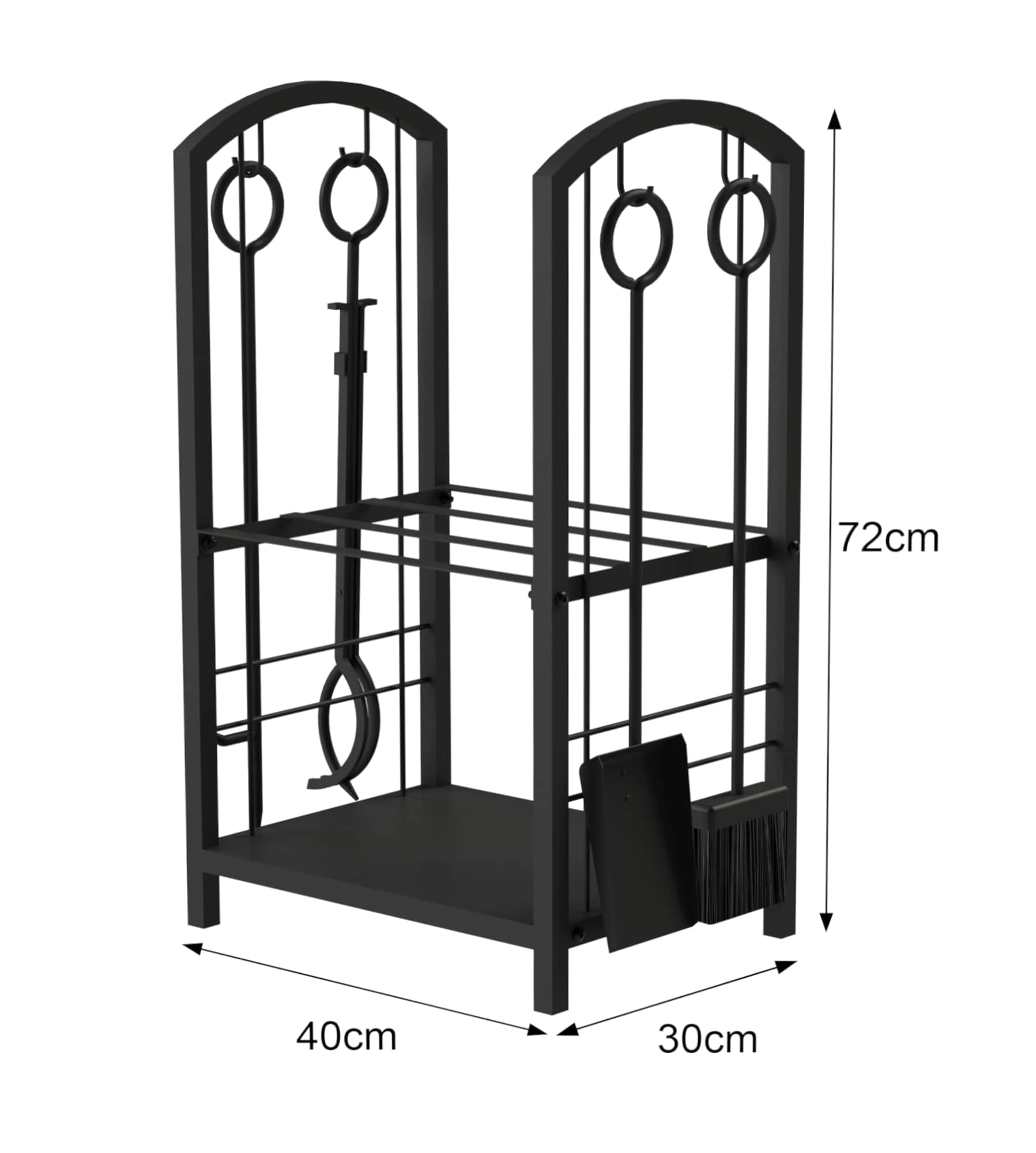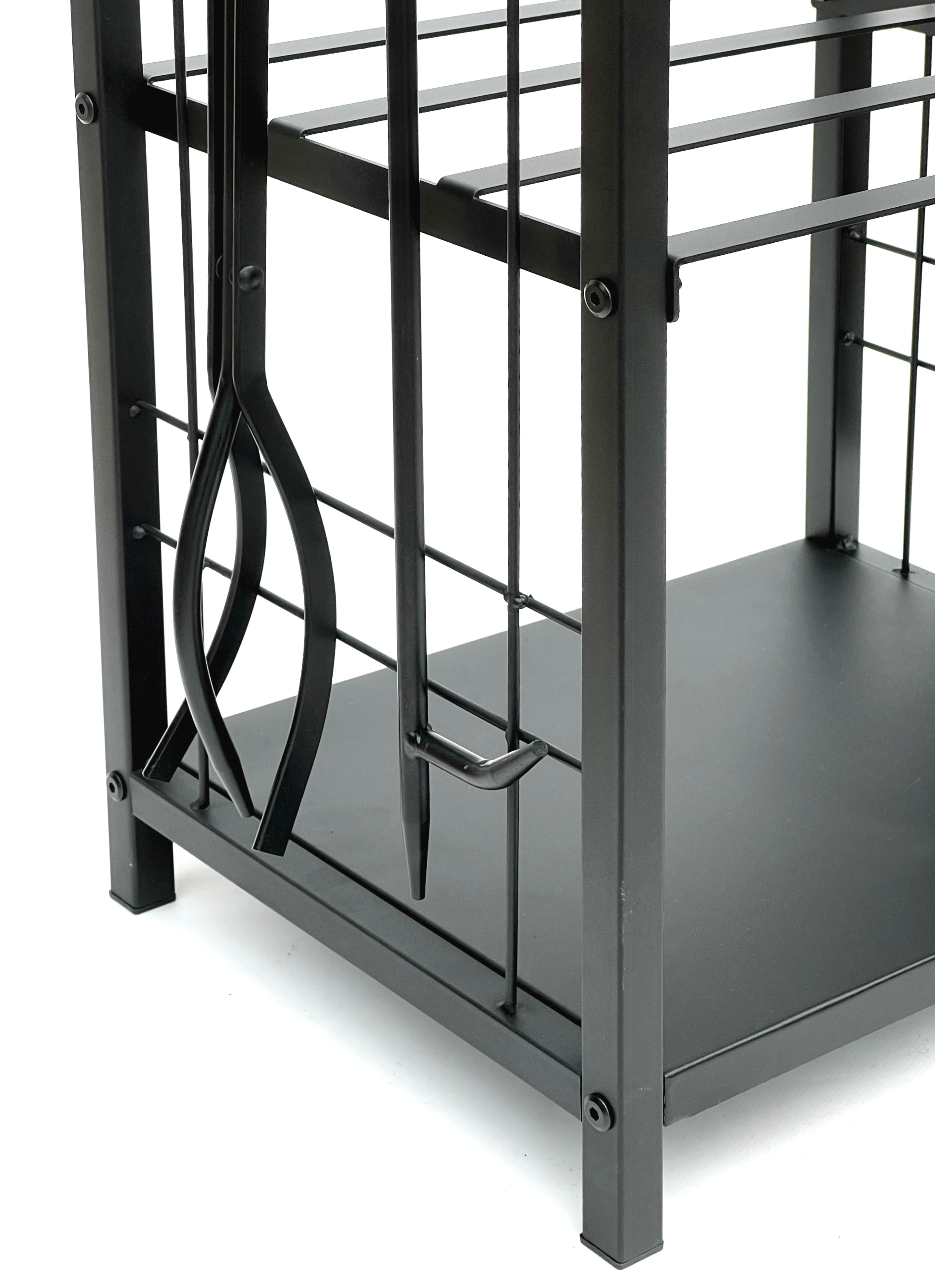 HIGH QUALITY DESIGN - The elegant firewood rack in black made of powder-coated metal combines stylish design with practical functionality and also contains high-quality cutlery to use and maintain your fireplace in style.