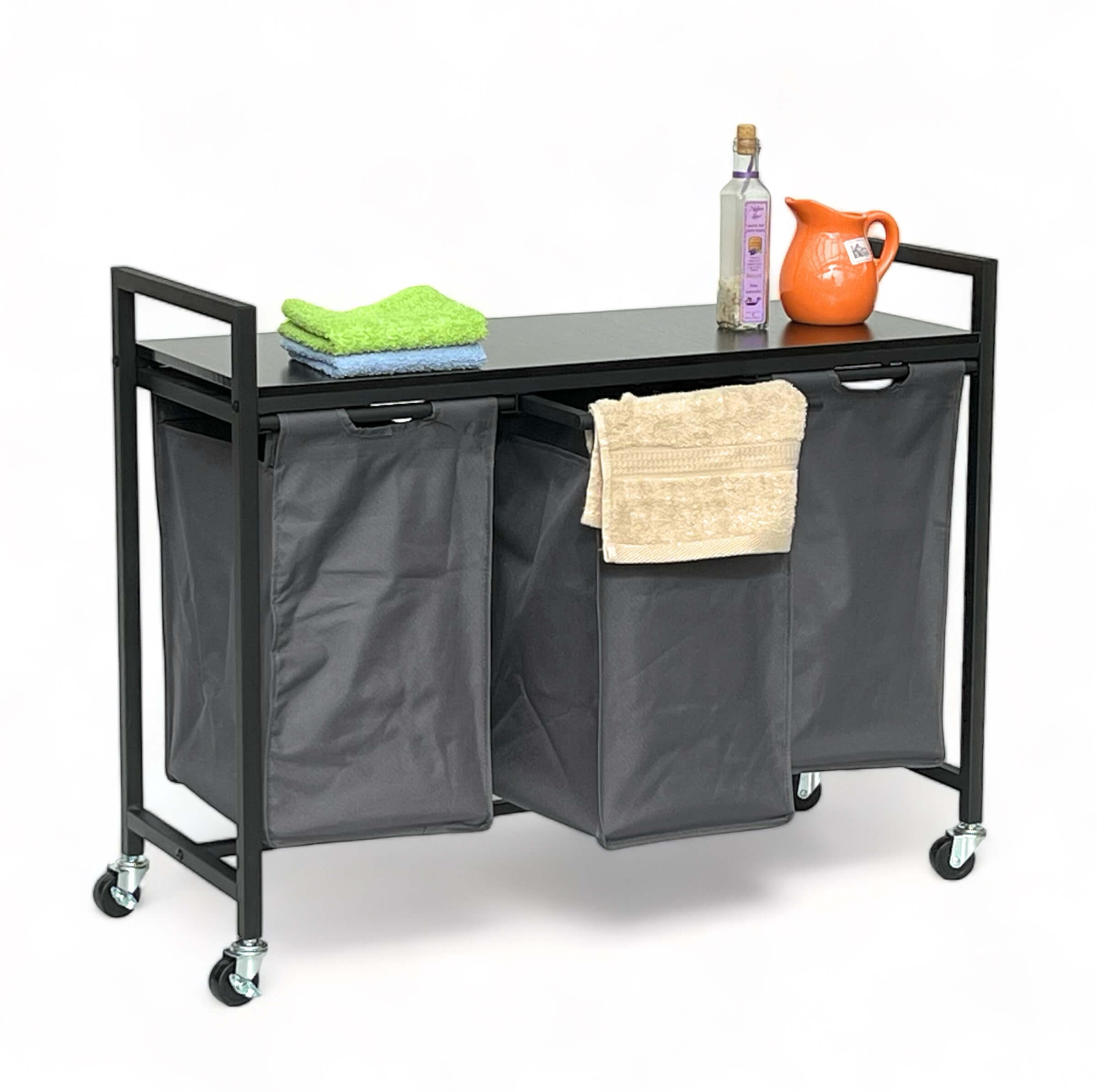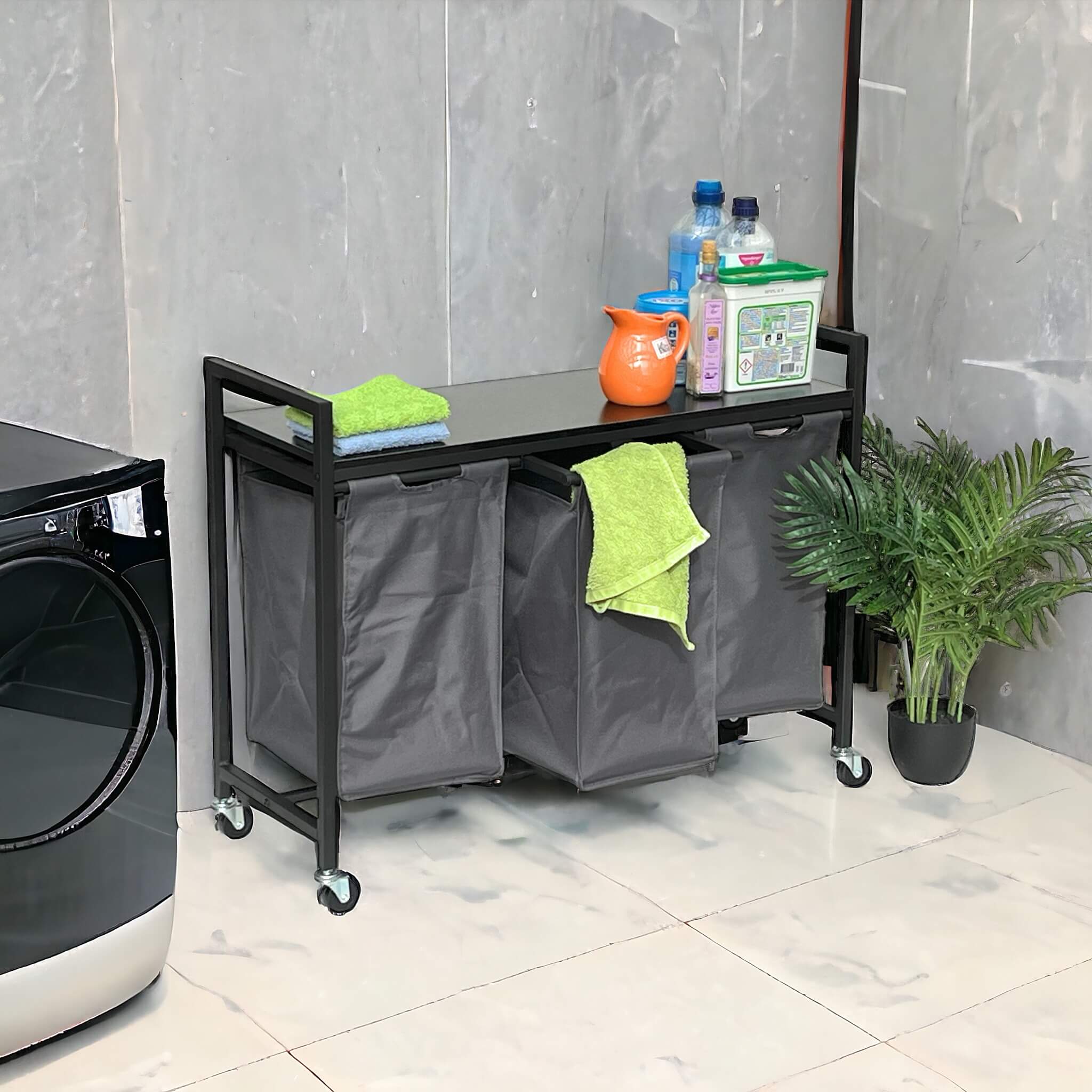 LARGE STORAGE SPACE - The generous dimensions of this laundry trolley allow for efficient storage of laundry in three removable grey laundry bags. Its width allows for easy storage of larger quantities of laundry, while the removable bags offer flexibility for sorting and transport. The tray can also be used as an additional storage option.