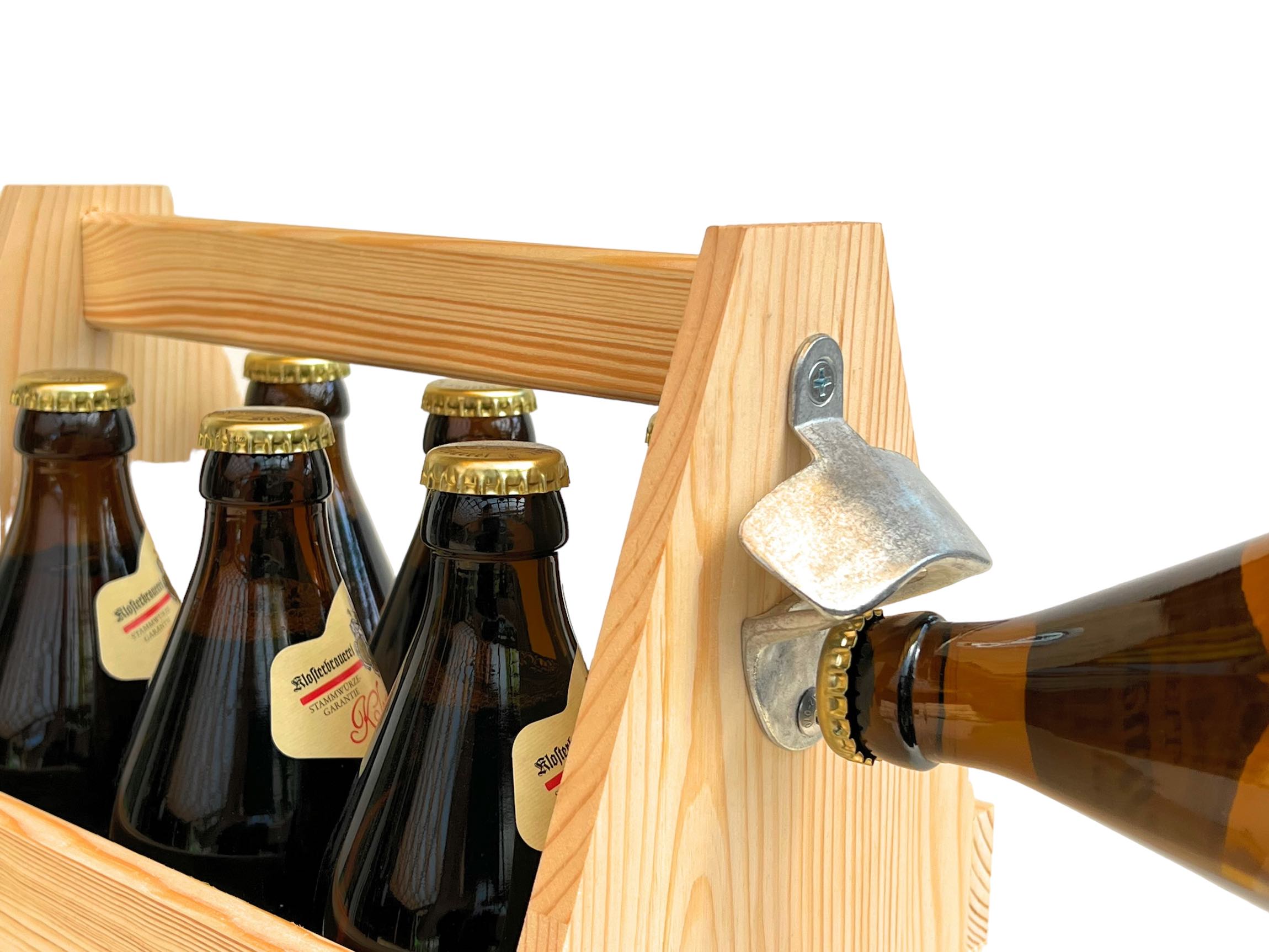 Bottle carrier for 6 bottles made of wood with attached bottle opener