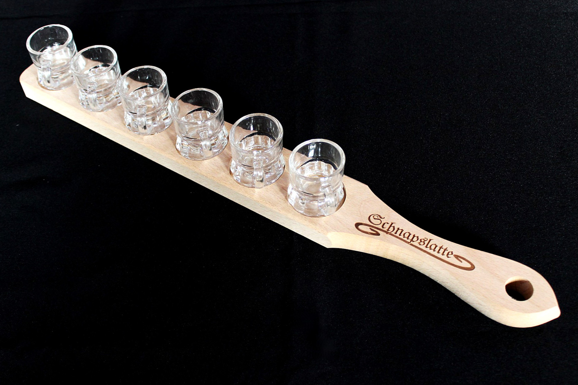 Schnapps bar made of untreated beech wood with engraving "Schnapps bar".Includes 6 glass schnapps glasses with handle.Dimensions: length 52 cm, width 5.5 cm, height 2 cm.