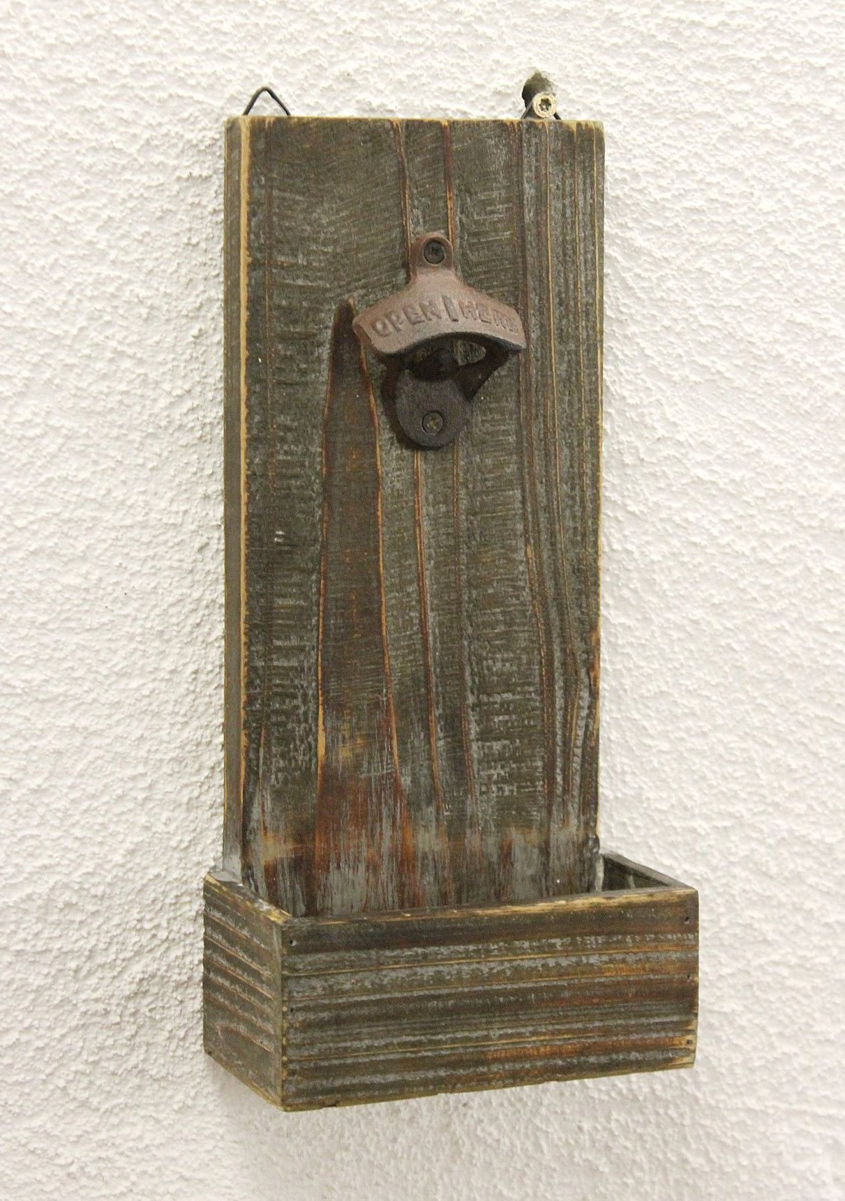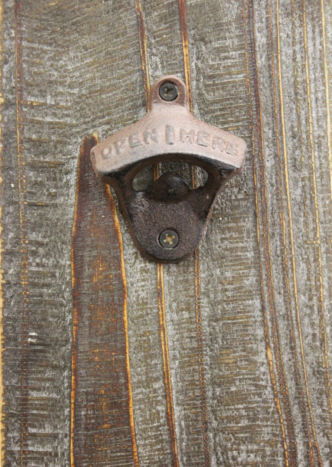 Bottle opener with crown cork container. Made from MDF and metal. Very decorative. Dimensions: height 32 cm, width 15 cm, depth 8 cm.