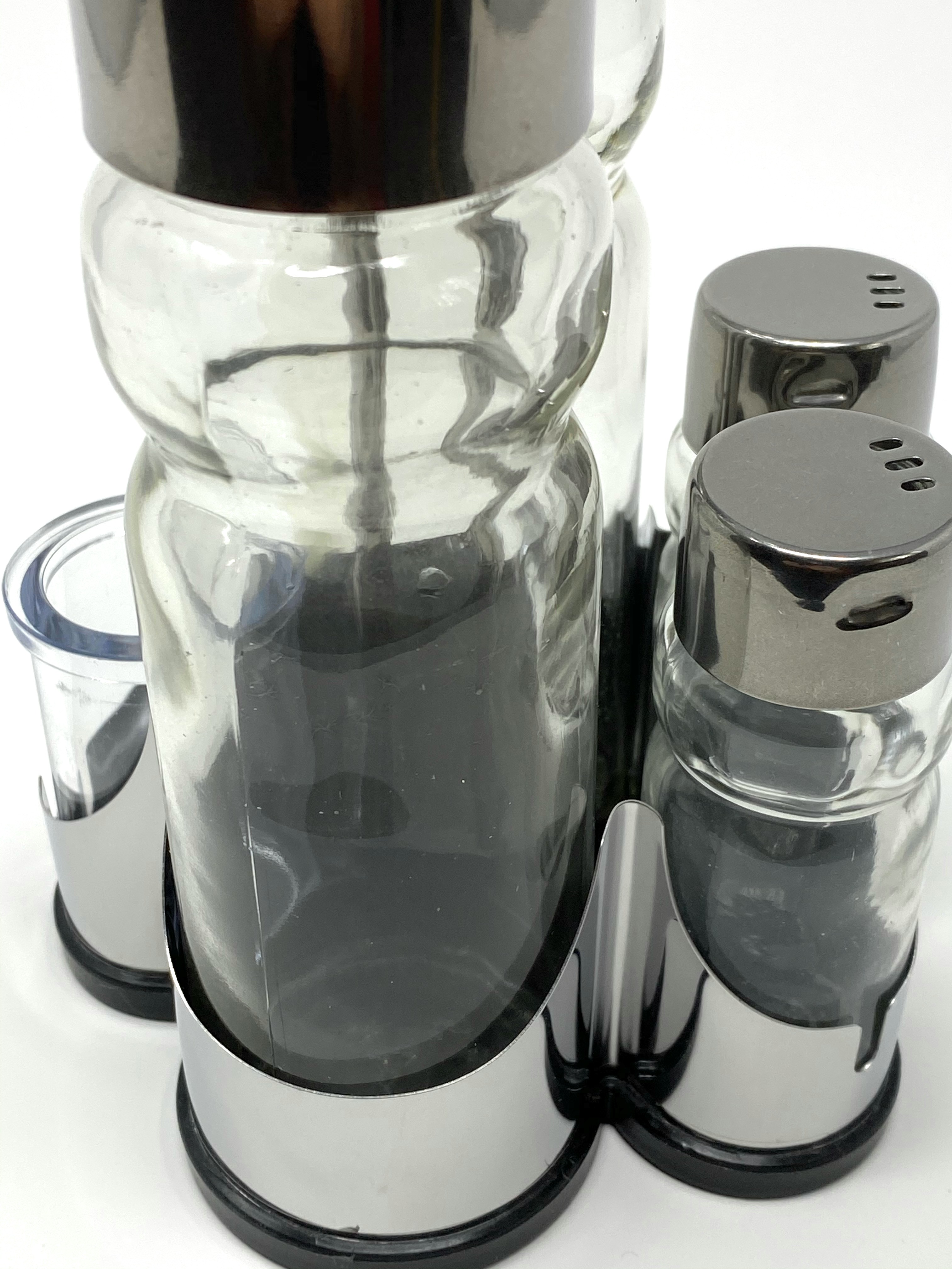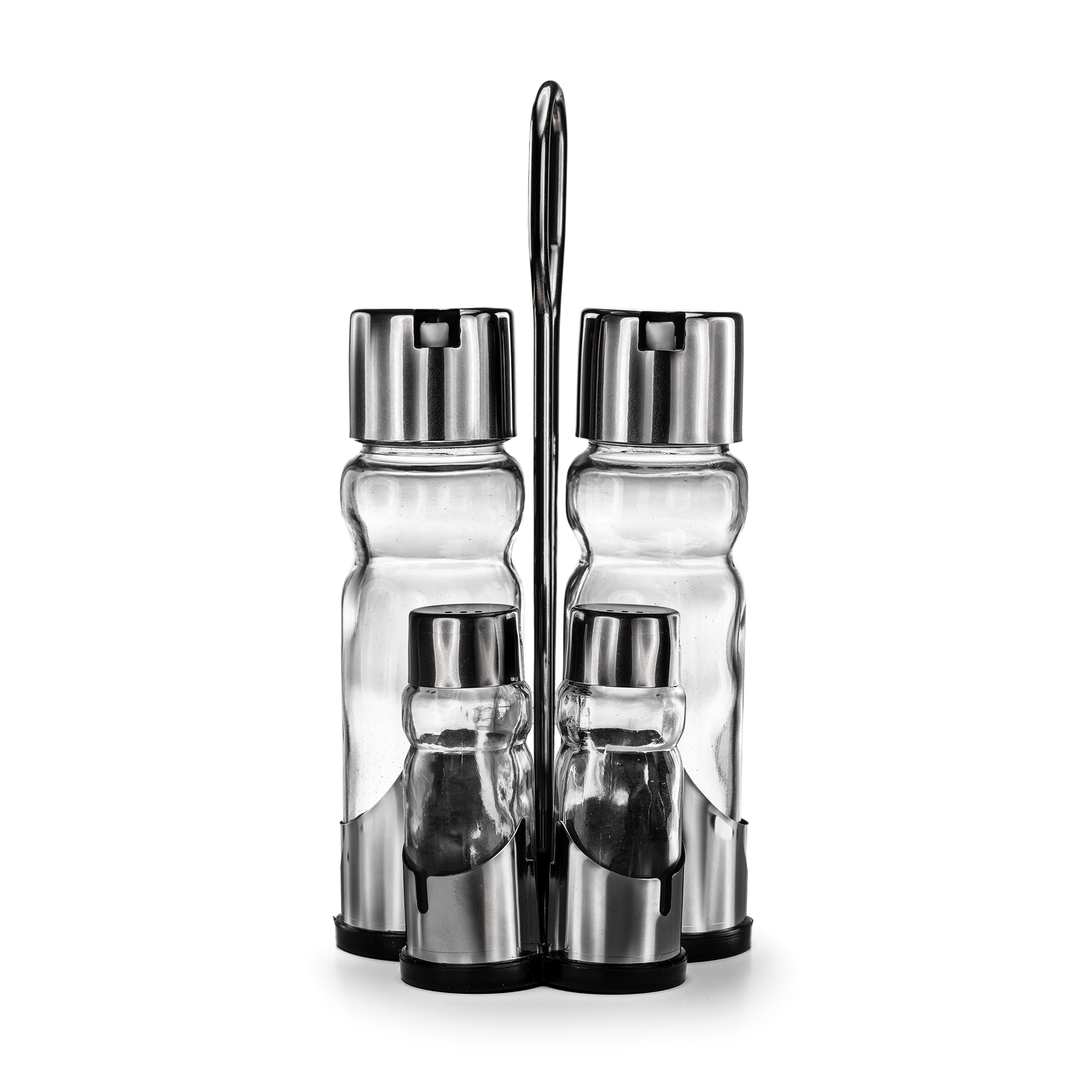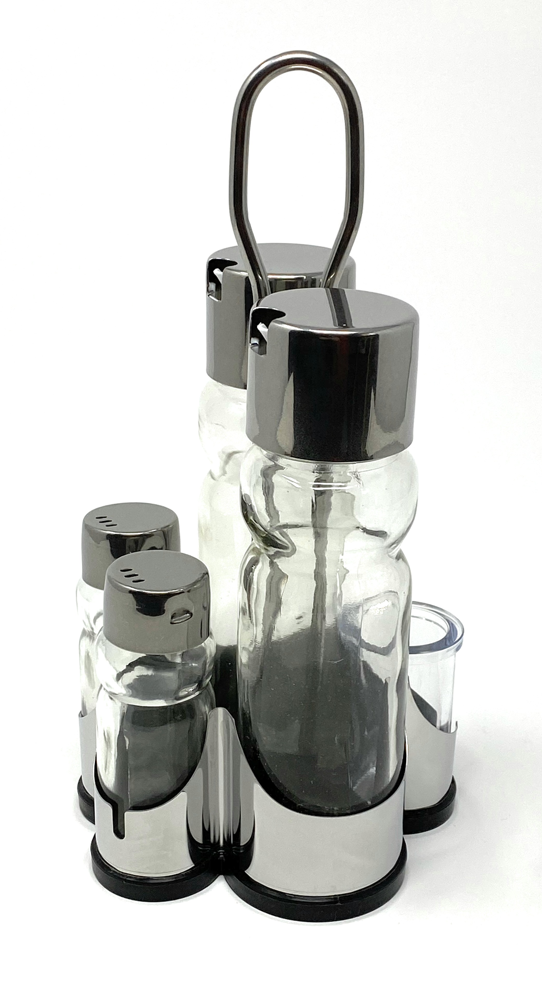The round place setting consists of a vinegar dispenser and oil dispenser 170 ml, as well as a salt shaker / pepper shaker 50 ml and a plastic toothpick container.