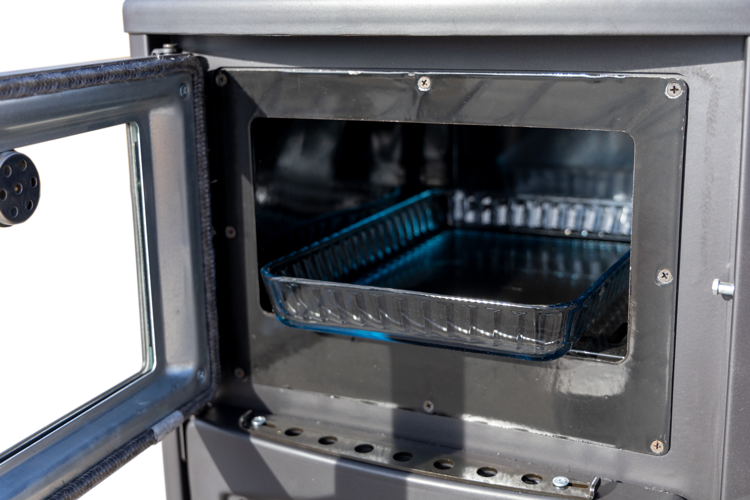 To check the temperature in the oven, a thermometer is attached to the glass.